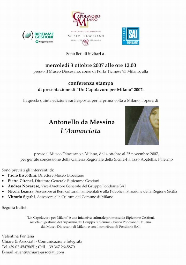 Sono state ufficializzate oggi le date definitive della quinta edizione di “Un Capolavoro per Milano”, evento promosso al Museo Diocesano da Bipiemme Gestioni con il contributo di SAI Fondiaria. L’Annunciata (1475?) di Antonello da Messina sarà esposta per la prima volta a Milano dal 4 ottobre al 25 novembre prossimi nelle sale del Museo sito nei Chiostri di Sant’Eustorgio. L’opera potrà essere ammirata tutti i giorni, dalle ore 10 alle 18, escluso il lunedì. Il capolavoro del Quattrocento italiano, ora fresco di un’accurata campagna di analisi diagnostiche e non invasive a cura del Centro Regionale per la Progettazione e il Restauro di Palermo, proviene dalla Galleria Regionale della Sicilia di Palazzo Abatellis a Palermo, a cui era stato donato nel 1906 da monsignor Vincenzo Di Giovanni.
