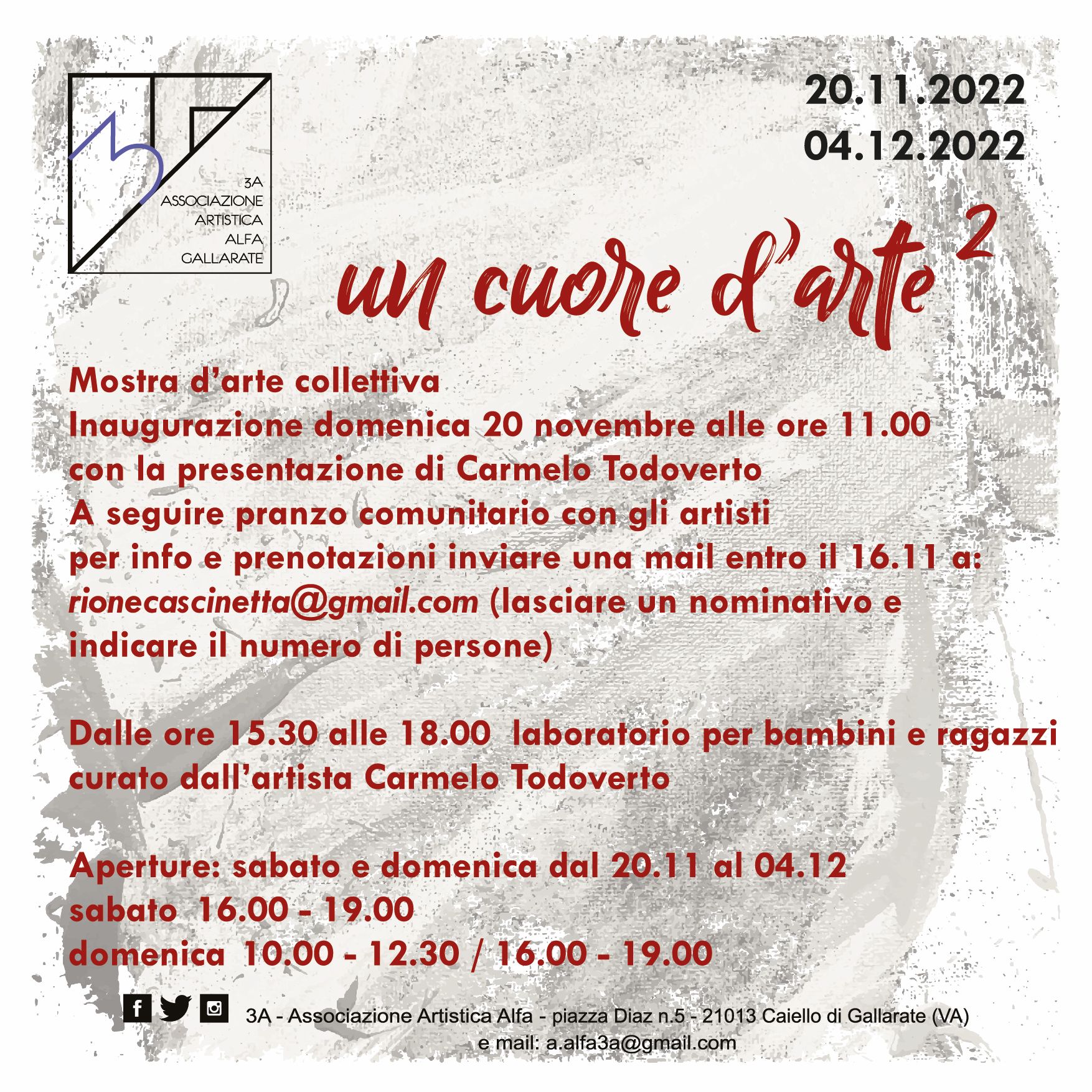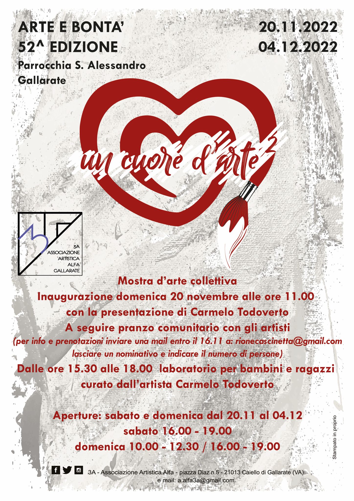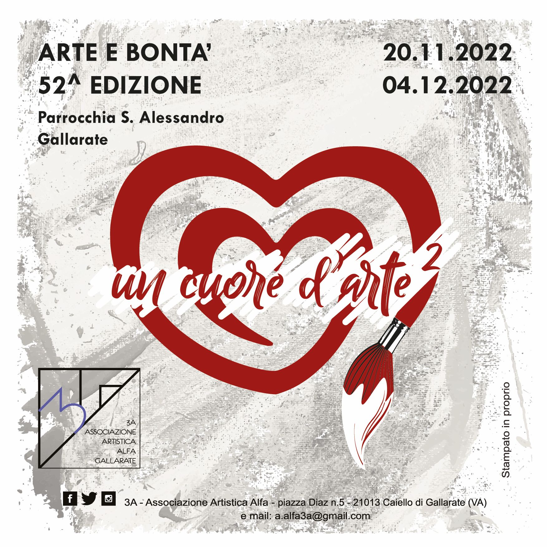 La cinquantaduesima edizione della Giornata dell’Arte e della Bontà, presso la Sala della Parrocchia di S. Alessandro – rione Cascinetta – Gallarate. L’attuale edizione intitolata “Un cuore d’arte” sulla collaborazione dell’Associazione Artisti 3A sul tema dell’AMORE e BONTÀ.