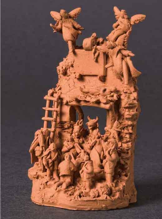 Scene sacre di dimensioni incredibili – dagli 8 mm sino ad un massimo di 10 cm – catturano lo sguardo dello spettatore e lo commuovono con il minuzioso, svariato popolo delle figure tipiche, plasmate da monoblocchi in terracotta rigorosamente lasciati al loro colore naturale, perché, spiega l’artista salernitano “continuo a creare senza colori perché mi è rimasto nel cuore e nella mente il colore dei mattoni della mia infanzia e della mia terra. Credo che, con i colori, non mi ritroverei nelle mie origini. Che amo.”