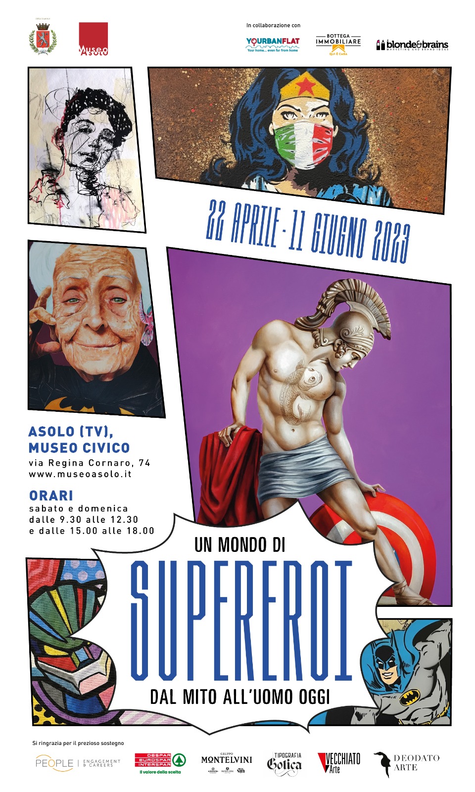La mostra “Un Mondo di supereroi. Dal Mito all’uomo oggi”, nata da un progetto di Enrica Feltracco e Massimiliano Sabbion insieme a Yourbanflat, Bottega Immobiliare e Blonde and Brains, realizzata grazie al supporto del Comune di Asolo, People HR, Aspiag Service Srl Despar e Montelvini sarà inaugurata sabato 22 Aprile, alle ore 17.30 in Sala Consiliare e successivamente nelle sale del Museo e Torre Civica di Asolo.