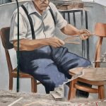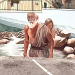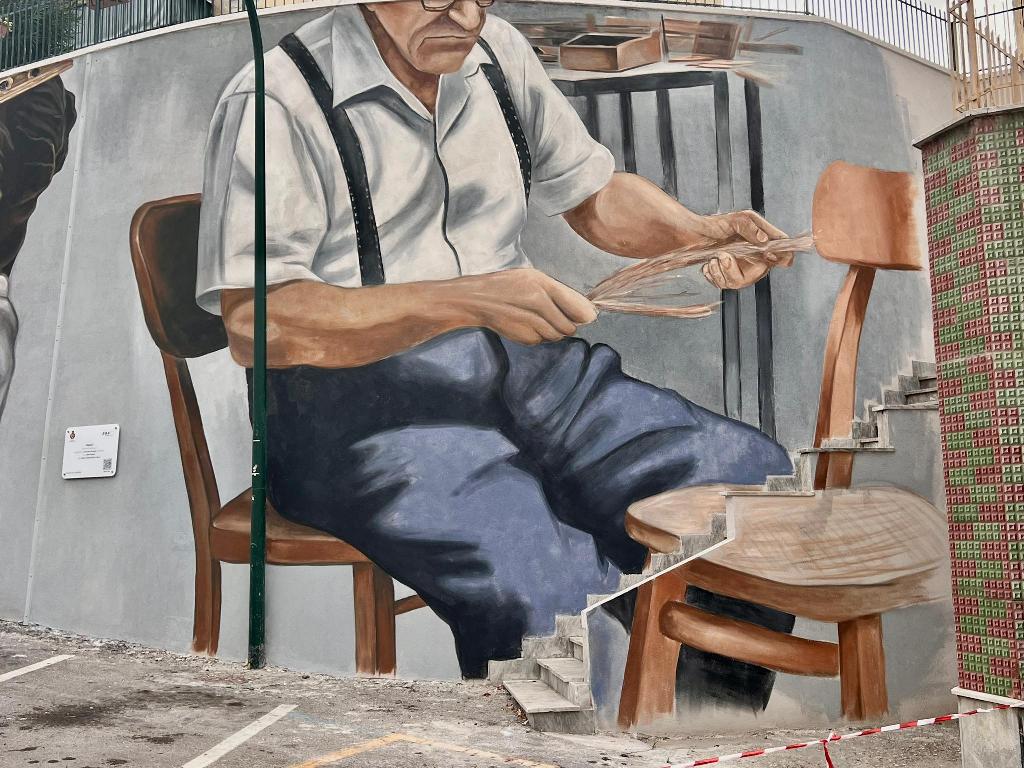 Infine, il murale culmina con un tributo all’artigianato e alla vita sociale di Francavilla in Sinni, rappresentando un artigiano intento a impagliare una sedia. Questa immagine non è solo un omaggio a un mestiere scomparso, ma un richiamo alla manualità, alla tradizione e alla comunità che ha caratterizzato il tessuto sociale della città.