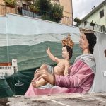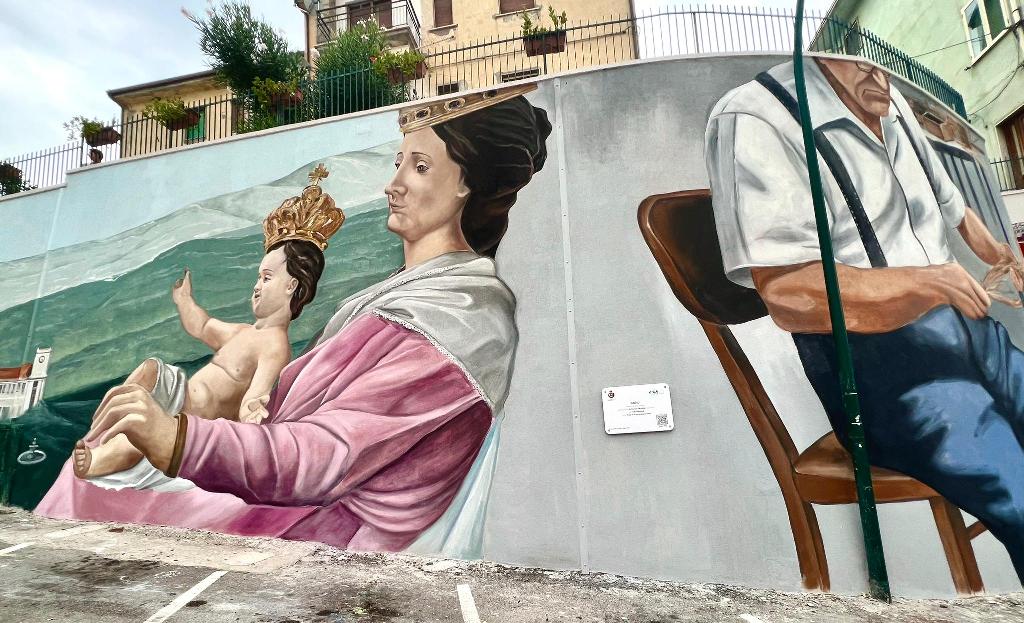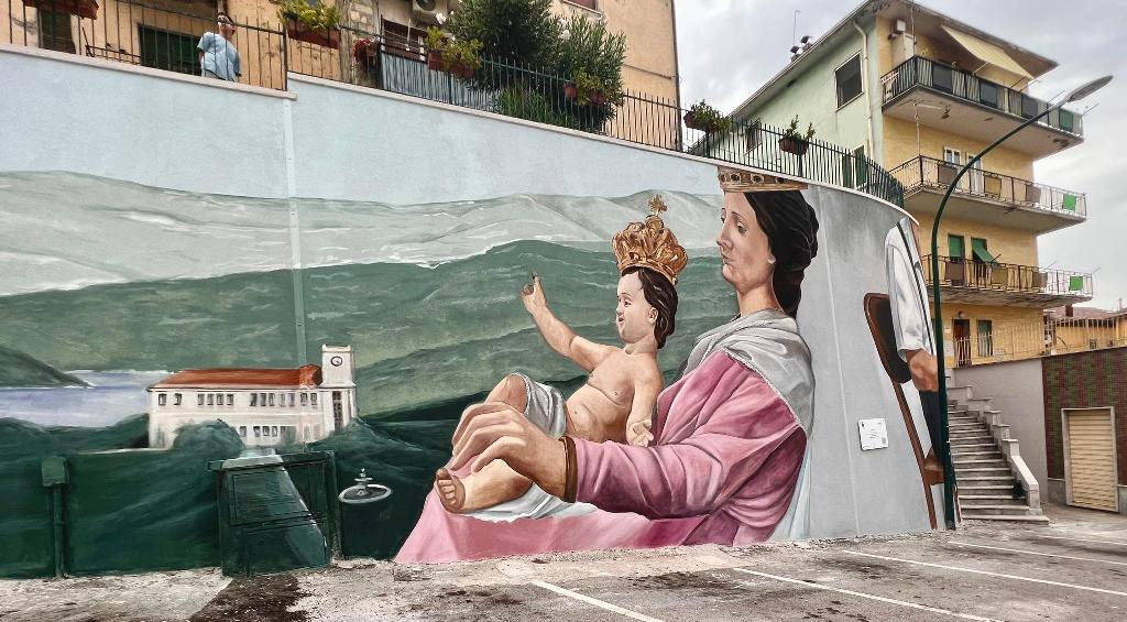 Si prosegue con la rappresentazione dei resti della porta di accesso al possedimento monastico, ovvero le mura che un tempo proteggevano il monastero e la comunità, mentre avanzando l’attenzione viene catturata dalla Madonna di Pompei ritratta in un contesto evocativo e rivolta verso la montagna, come a salire insieme ai fedeli durante la tradizionale processione a lei dedicata, in un cammino spirituale che si snoda tra il santuario e la città.