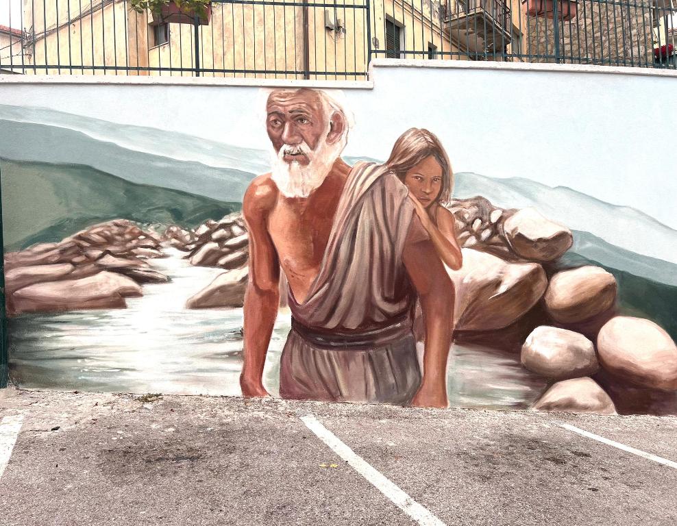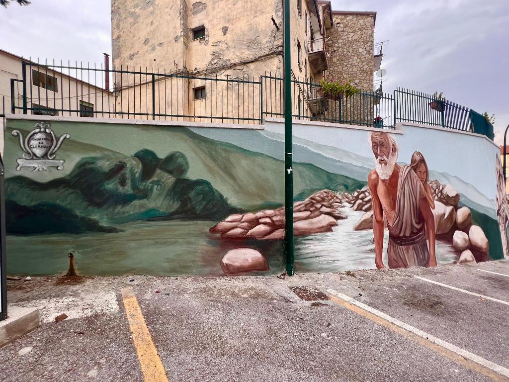 Il dipinto iniziale rende omaggio alla Certosa di San Nicola, maestoso monumento storico del paese, e colloca il fiume Sinni quale elemento centrale ritraendo il “passatore”, figura leggendaria della storia locale che, fino agli anni '30, si racconta accompagnasse le persone da una sponda all’altra del fiume, un po’ come il Caronte dantesco del luogo.