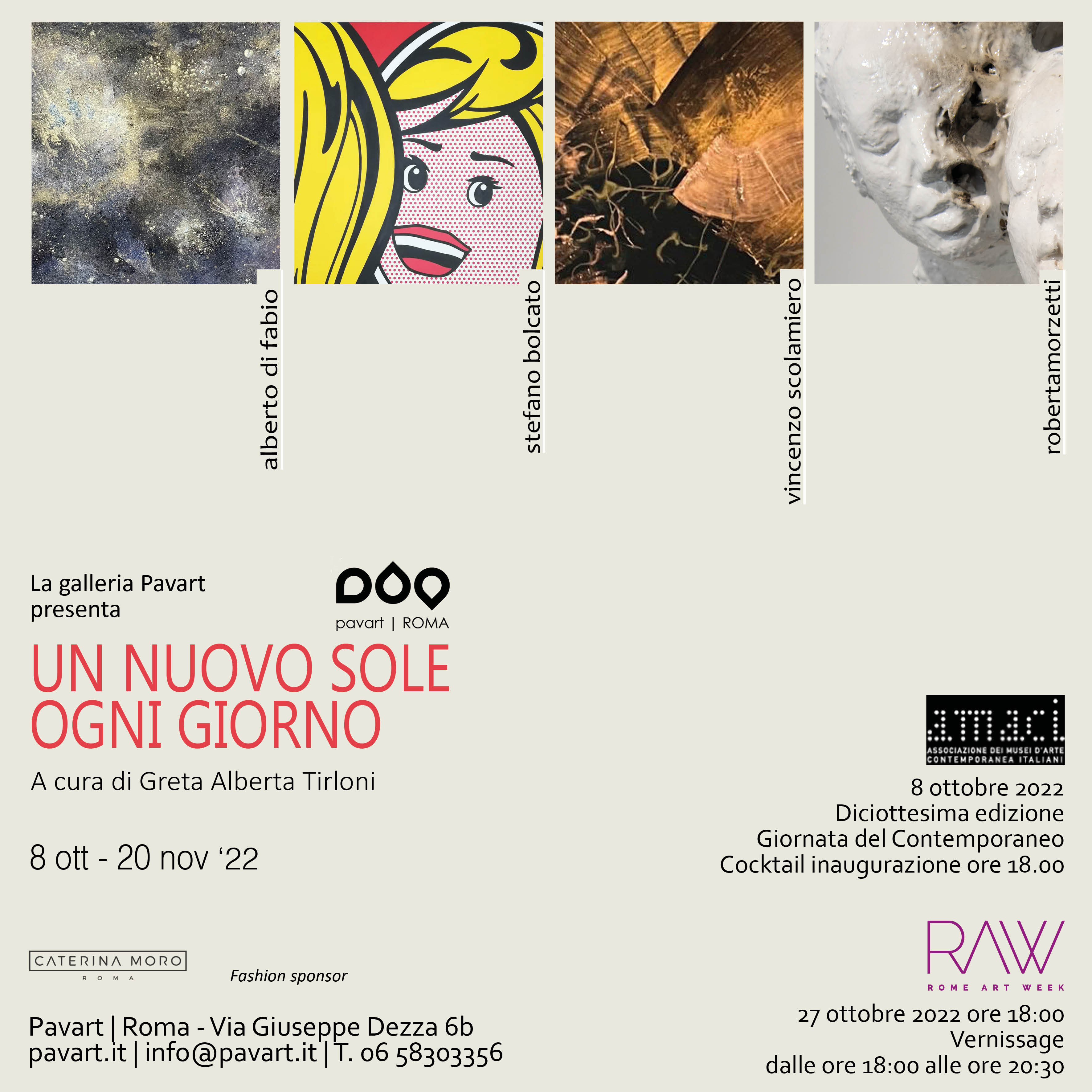 Un nuovo sole ogni giorno è una mostra collettiva che si terrà da 8 ottobre a 20 novembre 2022, in occasione dei tre importanti eventi di arte contemporanea in Roma: la Giornata del Contemporaneo di Amaci, Rome Art Week, la Fiera Arte in Nuvola. La mostra, a cura di Greta Alberta Tirloni si terrà presso la Galleria Pavart di Velia Littera, in via Dezza 6b Roma nello storico Monteverde Vecchio.