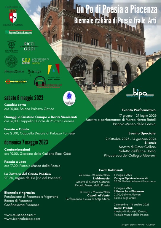 Il 6 e il 7 maggio 2023, dopo gli appuntamenti di Alessandria e Tortona, la “Biennale Italiana di Poesia fra le Arti” approda a Piacenza, con una due giorni di poesia, arte e cultura, nel segno dell’inclusione e della contaminazione. Sono inoltre in programma importanti mostre, eventi speciali, performativi, internazionali e collaterali sino al mese di gennaio 2024.