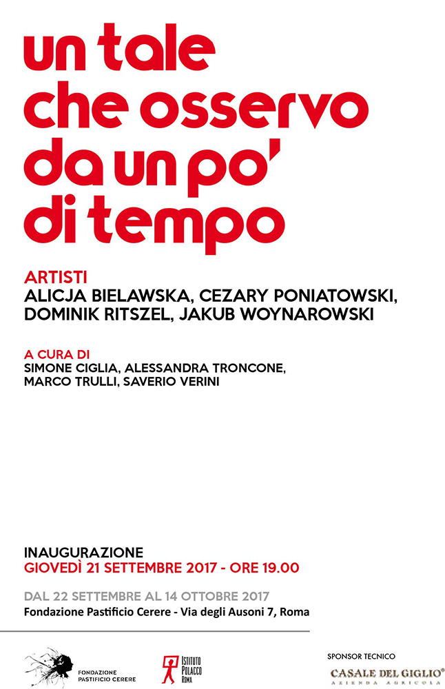 Giovedì 21 settembre 2017 alle ore 19.00, l’Istituto Polacco di Roma e la Fondazione Pastificio Cerere presentano la mostra collettiva Un tale che osservo da un po' di tempo, con opere di Alicja Bielawska, Cezary Poniatowski, Dominik Ritszel e Jakub Woynarowski, a cura di Simone Ciglia, Alessandra Troncone, Marco Trulli e Saverio Verini. La mostra sarà aperta al pubblico dal 22 settembre al 14 ottobre 2017.