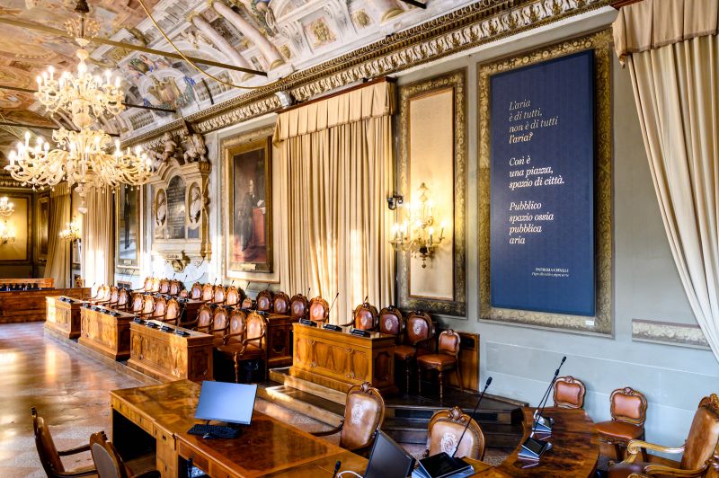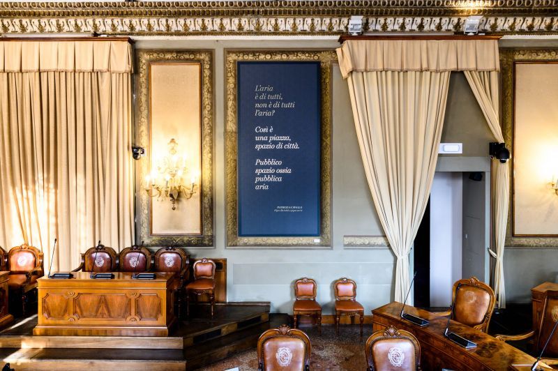 Una installazione con i versi di Patrizia Cavalli nella Sala del Consiglio comunale di Bologna