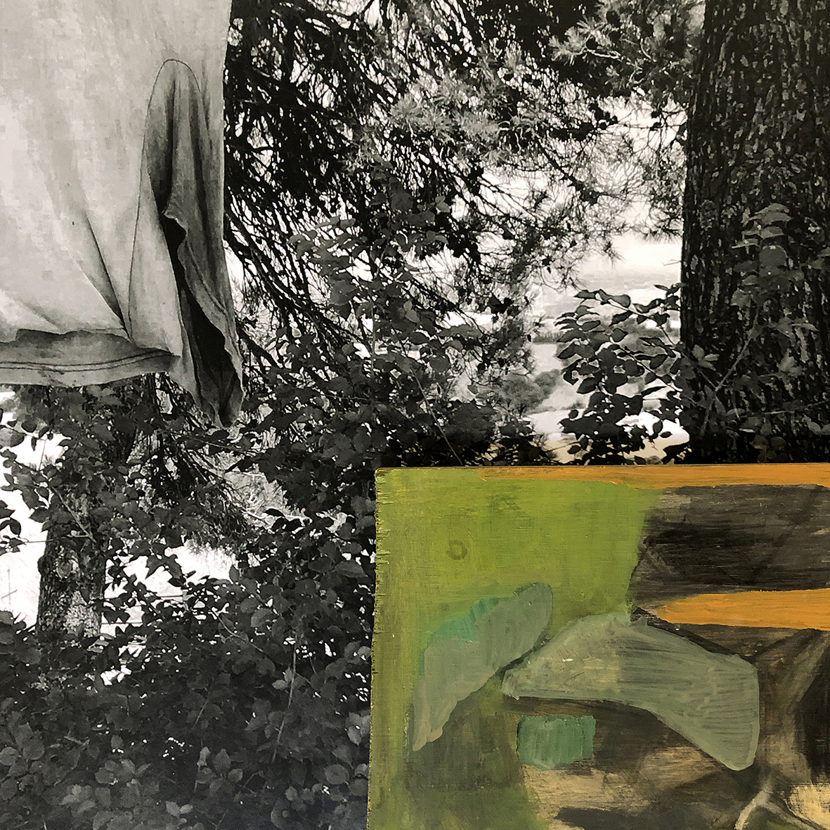 Nell’ottobre del 2018 sono stata invitata a Casa Sponge per una breve residenza curata da Angelo Bellobono e Giovanni Gaggia sul tema del paesaggio.Nella giornata dedicata alla pratica della pittura en plein air avevo scelto di dipingere accanto alla finestra di una casetta verde, forse un ripostiglio per attrezzi, ai margini di Montesecco, un piccolo borgo affacciato su un’ampia valle. La vicinanza della casa e alcuni arbusti racchiudevano la vista a quell’orizzonte aperto che gli altri pittori avevano scelto di ritrarre, lasciando che il mio sguardo non si smarrisse. Durante il lavoro uno dei pochi abitanti del paese portò da bere una bottiglia del suo vino, a quel gruppo variegato di pittori e dopo averci rifocillato ritornò sui suoi passi.