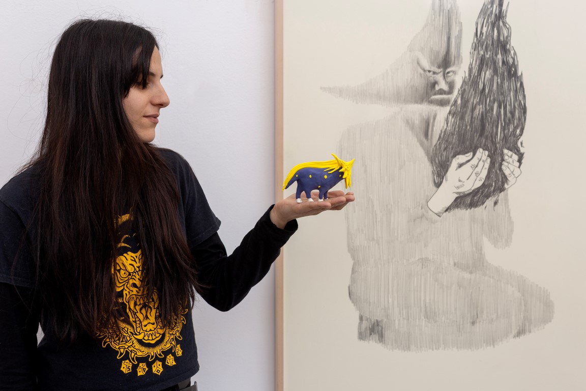 L'artista presenta per la prima volta le sue sculture in compagnia di alcuni disegni di grande e piccolo formato. L’evidente dicotomia nel lavoro di Mascitti tra la scultura di aspetto ludico e il disegno, spesso con sembianze austere, è massimizzata grazie all’accostamento allestitivo. Gli approcci drasticamente differenti con i quali l’artista affronta i due medium sono il punto di snodo dal quale artista e curatrice (Miral Rivalta) hanno sviluppato il progetto espositivo. Le opere tridimensionali, colorate, di piccolo formato, sembrano entrare nell’architettura e fungono da spettatori, presentandosi come un unica installazione che si sviluppa su tutti i piani della torre. Nei disegni la figura maschile si vede raramente e assume sembianze innocue laddove la donna domina la rappresentazione. Colei che Mascitti ritrae, decorata da fuoco e fiamme, potrebbe rappresentare la Sibilla Appenninica, figura mistica del folklore italiano locale, una delle sue ancelle o forse l’artista stessa.