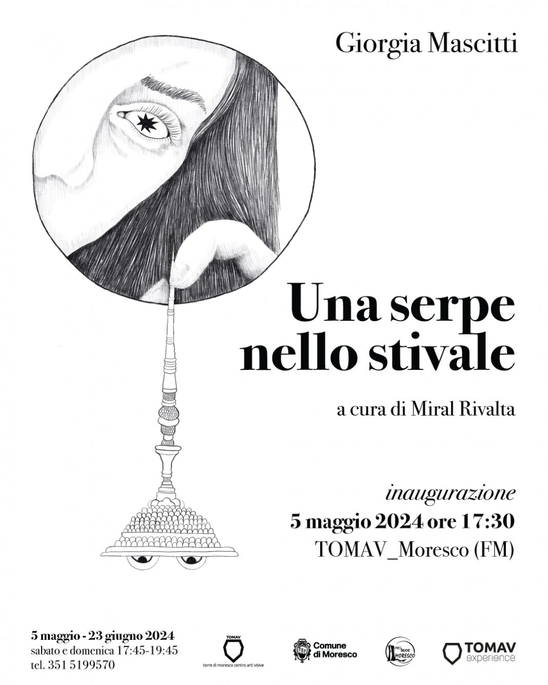 Domenica 5 maggio al Torre di Moresco Centro Arti Visive apre al pubblico la mostra personale di Giorgia Mascitti (San Benedetto del Tronto, 1995), Una serpe nello stivale. Per la mostra, aperta fino al 23 giugno, l’artista presenta una serie di lavori inediti.
