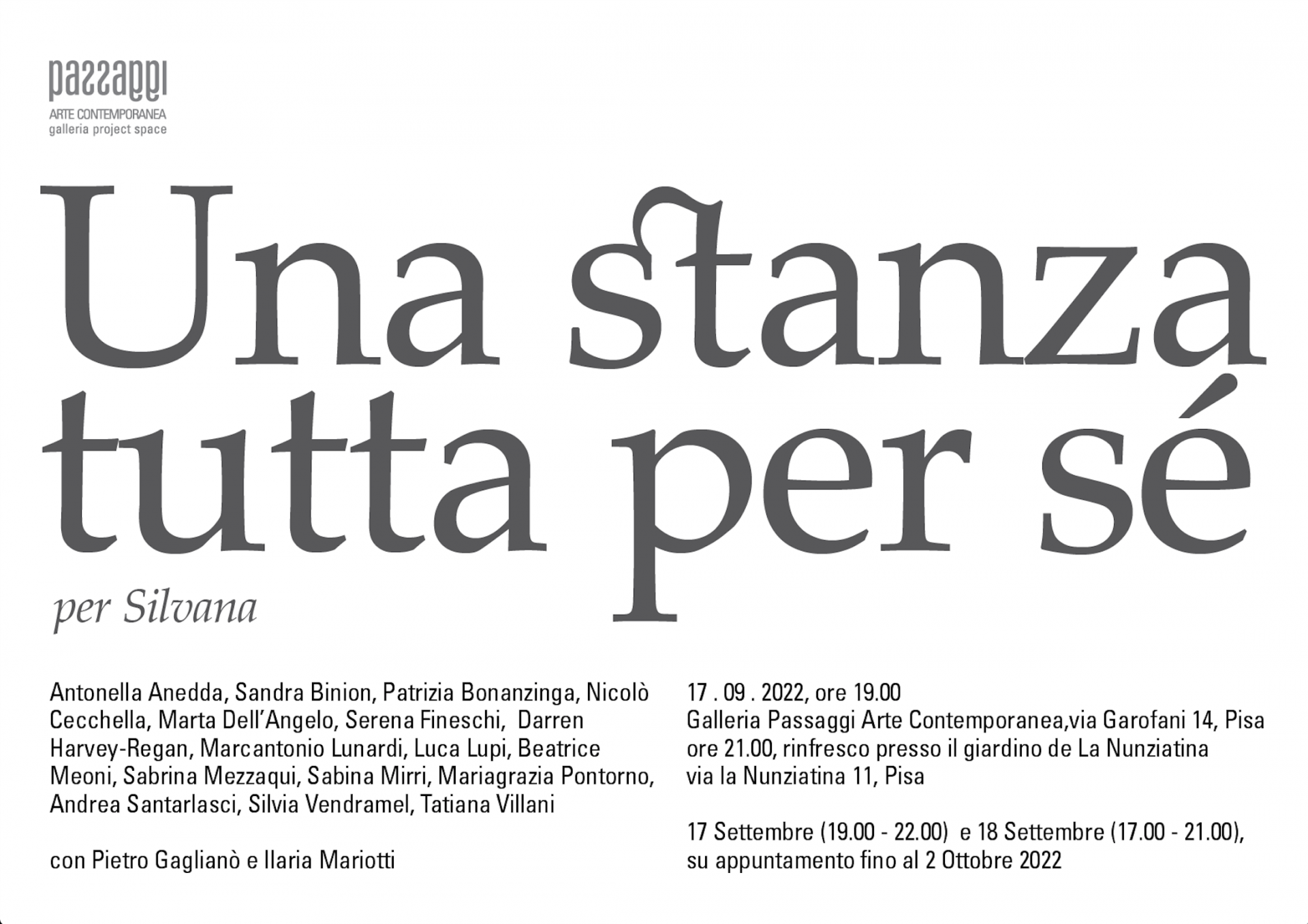 Le opere, provenienti da ricerche formali e concettuali molto variegate, compongono la traccia per un ricordo di Silvana radunandosi attorno all’ispirazione del celebre saggio di Virginia Woolf Una stanza tutta per sé. Il testo, una pietra miliare per gli studi di genere, viene qui adottato piuttosto come un “citazione biografica” di qualcosa che Silvana ha amato, condiviso e di cui ha fatto esperienza. Il titolo, inoltre, descrive bene cos’è stata la Galleria Passaggi: un luogo tutto per lei, appunto, necessario rispetto a un progetto ambizioso e sentito come indispensabile, un luogo privato ma la cui esistenza è stata possibile solo grazie all’incontro e alla condivisione. Un luogo vitale e fecondo grazie alla generosità, all’impegno e alla fiducia sua e di tutte le persone, i pensieri, le opere, le parole e i gesti che lo hanno abitato.