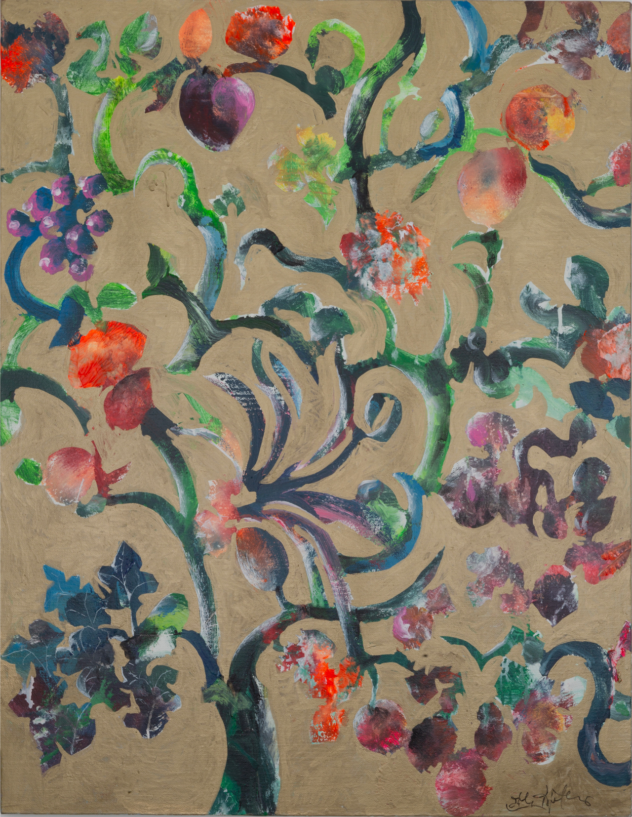 Dipinge atmosfere salentine, visioni oniriche, paesaggi quasi orientali con masserie e palme all’orizzonte. Il suo gesto naturale fa nascere germinazioni, viti, vigne, uva, fiori, frutto di un’alchimia di energia, poesia, passione, colore e materia che si trasformano in una forza quasi primordiale. Una narrazione visiva ricca, straripante, piena di vita, che si nutre della sua sensibilità mediterranea.