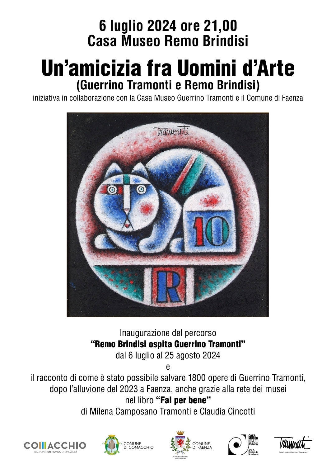 “La Casa Museo Remo Brindisi, commissionata dall’artista all'inizio degli anni '70 del secolo scorso per accogliere e rendere pubblica la collezione d'arte contemporanea da lui raccolta negli anni, è oggi un museo civico per lascito testamentario dello stesso artista al Comune di Comacchio. La struttura è stata da sempre, sin dalla sua concezione, abitazione-studio e museo aperto al pubblico insieme. E' stata concepita programmaticamente come esperimento di integrazione tra le arti e tra arte e vita. La collezione di Brindisi annovera circa 1100 opere, proprie (in minima parte) e di artisti suoi contemporanei. Il progetto della mostra parte da Un’amicizia fra Uomini d’Arte (Guerrino Tramonti, 1915-1992 e Remo Brindisi, 1918-1996). Dai luoghi che hanno inciso sulle loro formazioni, quali Roma, Penne e Castelli d’Abruzzo e Venezia, all’approdo finale a Lido di Spina, dove Guerrino Tramonti trascorreva le vacanze estive con la famiglia e Remo Brindisi si trasferì dal 1973 e identifica con le opere in ceramica contenute presso la Casa Museo Remo Brindisi di Lido di Spina e i vasi scultura provenienti da Casa Museo Guerrino Tramonti di Faenza un produttivo scambio che valorizzi entrambi i contenitori di eccellenze”.