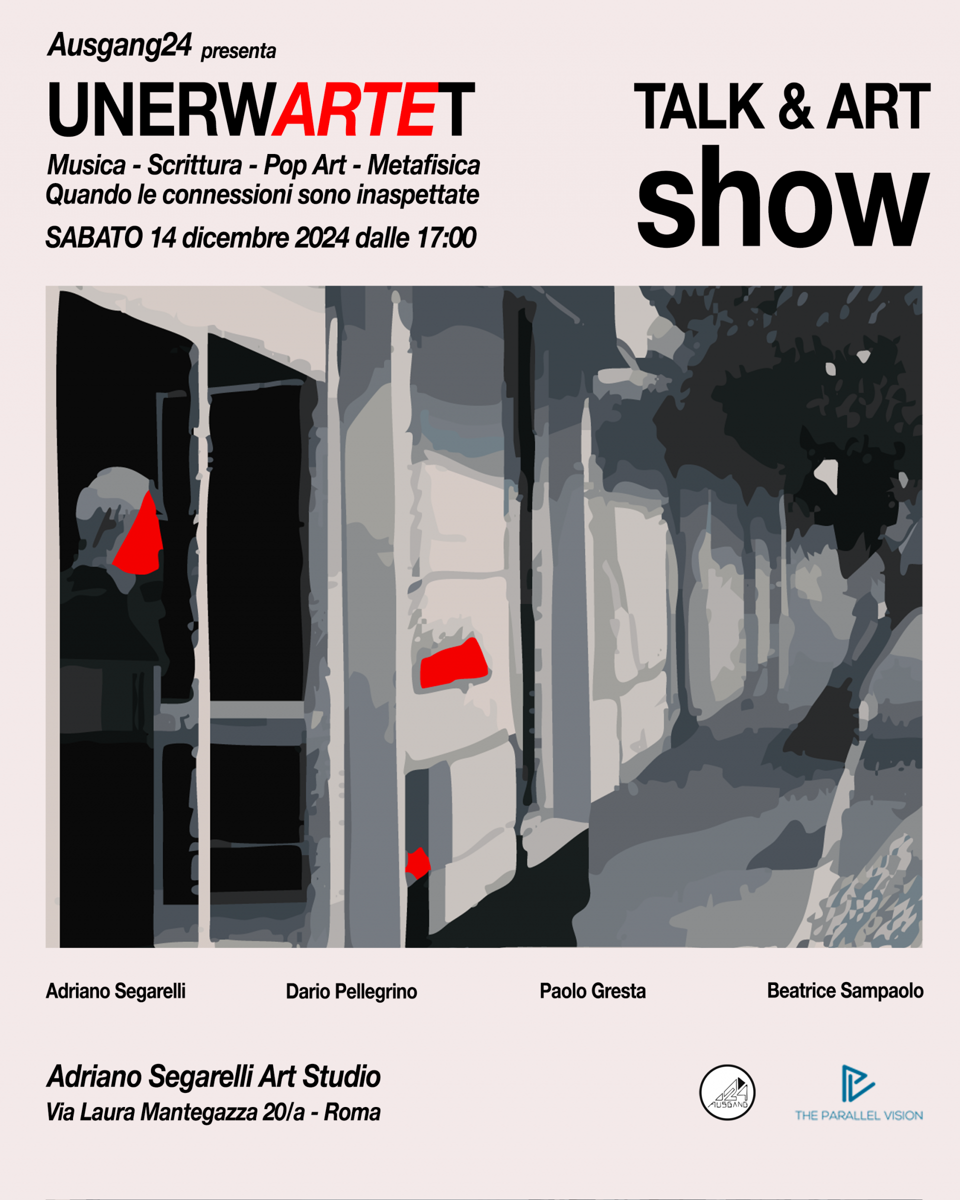 Vi sareste mai attesi un mondo così sorprendente? Nella pittura come nella musica tutto può accadere. Proprio per questo Ausgang24 invita il pubblico a partecipare all’evento culturale "Unerwartet" (inaspettato) tra musica, scrittura, pop art e metafisica.Discipline affini che fin dalla loro nascita sono in grado di creare connessioni inaspettate. Ma soprattutto dialogare tra loro e stimolare il pubblico a riflettere e a pensare a nuove idee e a come immaginare oggi il nostro mondo.