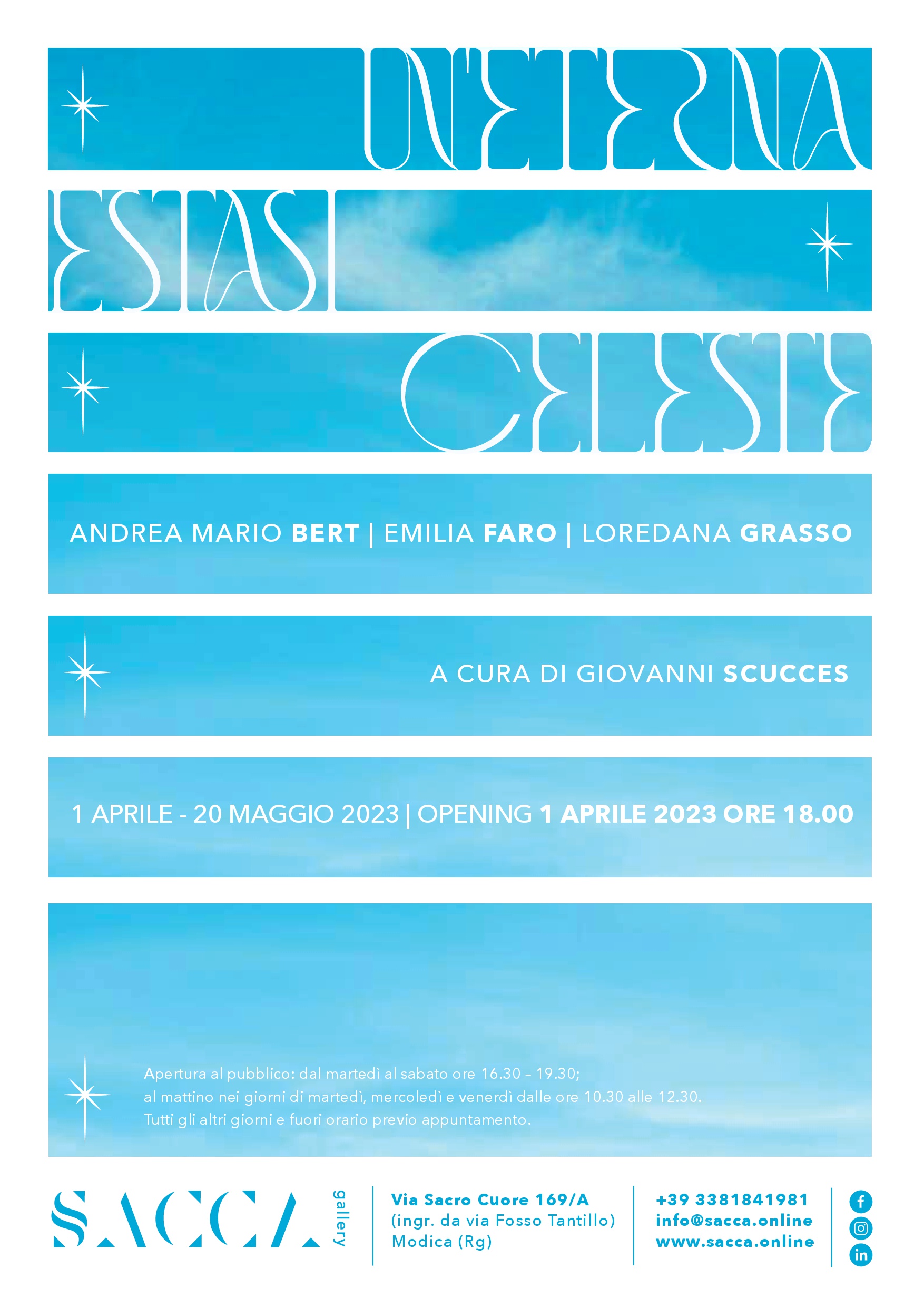 Sabato 1° aprile alle ore 18 la galleria SACCA, nella nuova sede di Modica, presenterà “Un’eterna estasi celeste”, un progetto espositivo con opere di Andrea Mario Bert, Emilia Faro e Loredana Grasso, curato da Giovanni Scucces.
