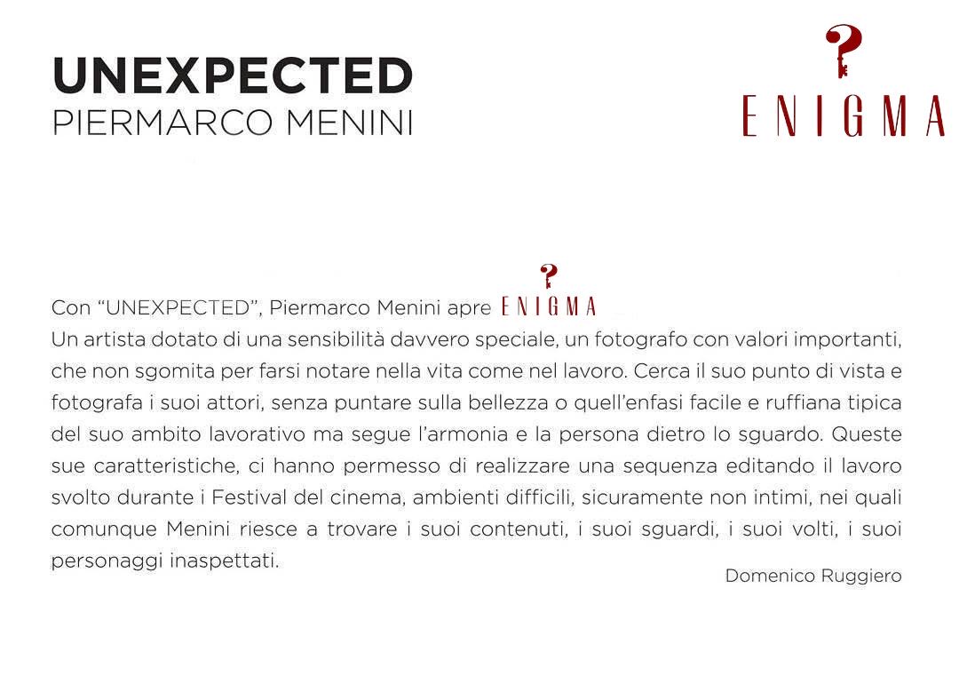 Unexspected di Piermarco Menini è una sequenza di ritratti di attori molto noti. Durante gli eventi ufficiali come i festival, l’artista cerca di trovare punti di vista e luoghi da cui riprendere i suoi soggetti in momenti di pausa o di evasione dei pensieri. La fotografia va oltre l’aspetto.