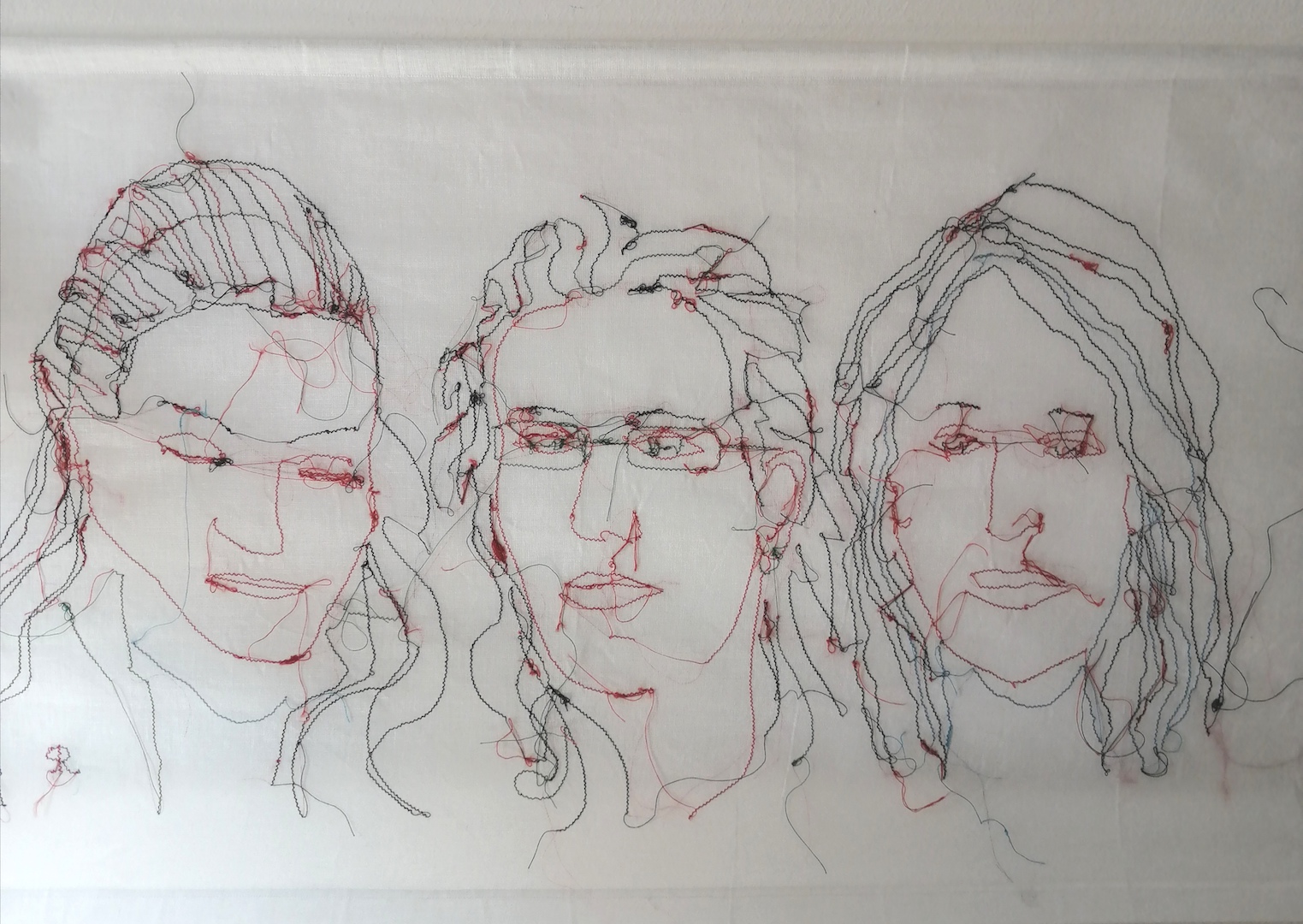 Cinque sono le opere: ragazza, attesa, autoritratto e due tele sul tema delle Tre Grazie. La grazia e la gentilezza che l’artista riesce a trasmettere attraverso la delicatezza dei segni leggeri rappresentati attraverso il filo e la macchina da cucire è sempre stata la sua caratteristica, come una macchina fotografica imprime attraverso l’obbiettivo una immagine l’artista rappresenta l’animo interiore oltre che la fisionomia dei personaggi.