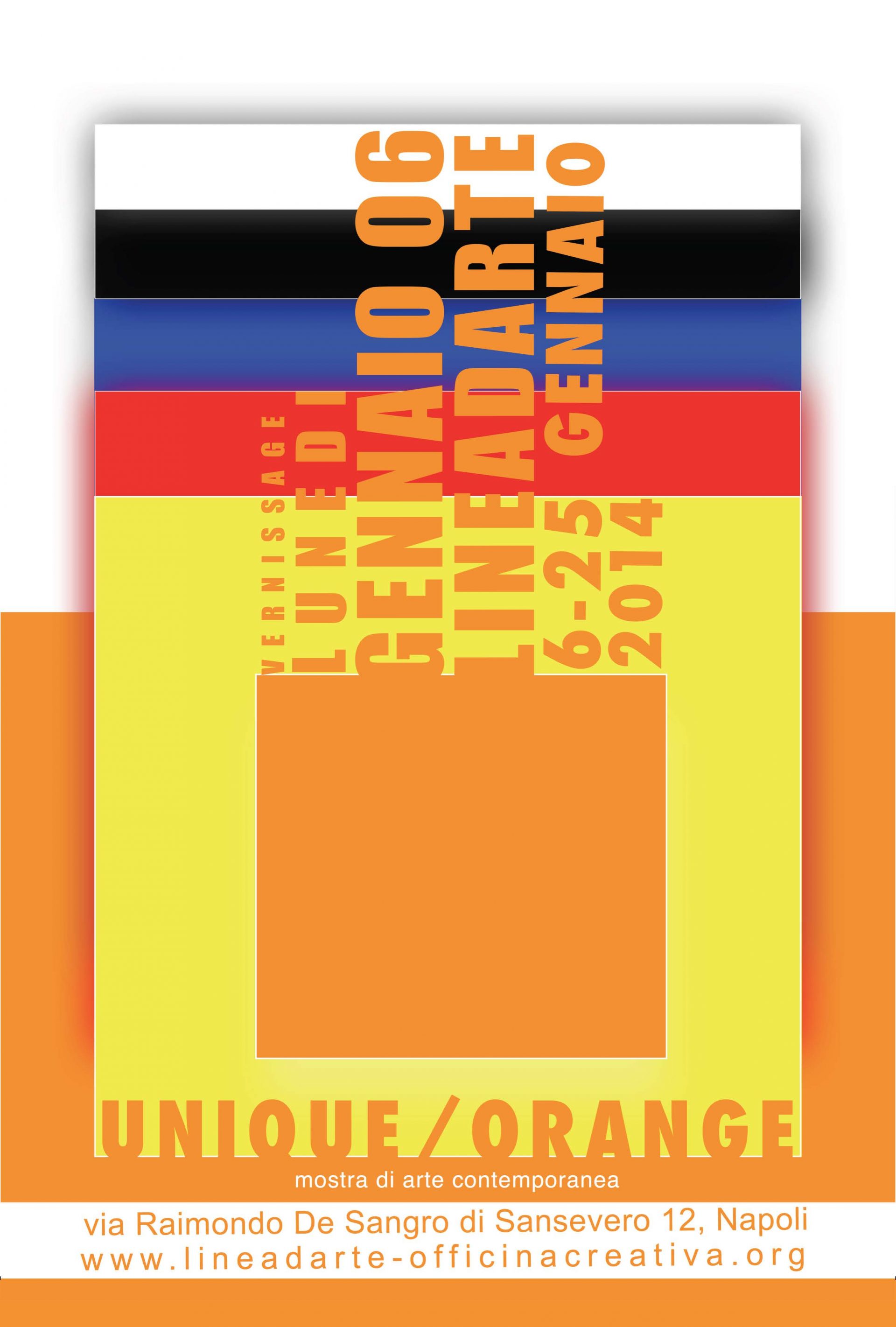 Il colore sia esso , primario, secondario o terziario è portatore, catalizzatore e rappresentazione di un emozione. Prima esperienza del ciclo Unique sarà Orange il primo colore sarà quindi il colore arancione. Gli artisti protagonisti di questa prima esposizione sono: Annamaria Terlati, Antonio Conte, Antonio Lubrano Lavadera, Claudia Mazzitelli, Cristina Manzi, Dario Di Franco, Elena Tabarro,Ermelinda Ponticiello, Fabiola Cenci, Francesco Gallo, Gennaro Ippolito, Gilda Niola, Gino Sansone, Giordano Martone, Giovanna Donnarumma, Irina Morokovskaia, Lucilla Campioni, Maria Manfredi, Marisa Traettino, Maria Mascia, Miona Markovic , Paolo De Meglio, PI&CI (Paola Piatti+Cecilia Bossi), Pino Lauria, Renato Iannone, Rosaria Cecere, Silvia Rea, Vincenza Rotondo, Zoro (Sandro Ippolito).