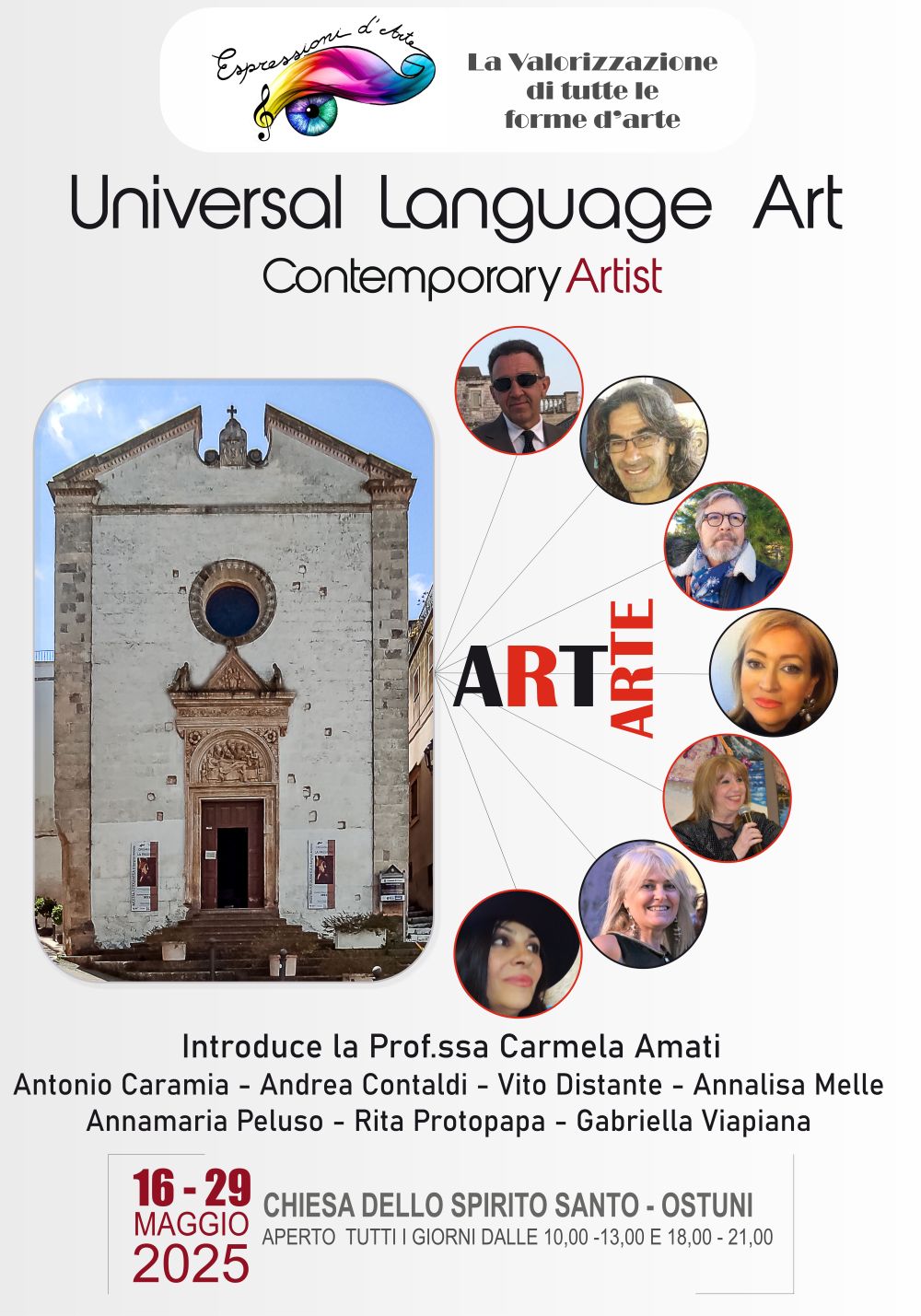 Dal 16 al 29 maggio, la Chiesa dello Spirito Santo di Ostuni ospiterà “Universal Language Art”, una rassegna artistica organizzata da Espressioni d’Arte. Sette artisti esploreranno il dialogo tra diverse forme d’arte. L’inaugurazione sarà presentata dalla prof.ssa Carmela Amati.