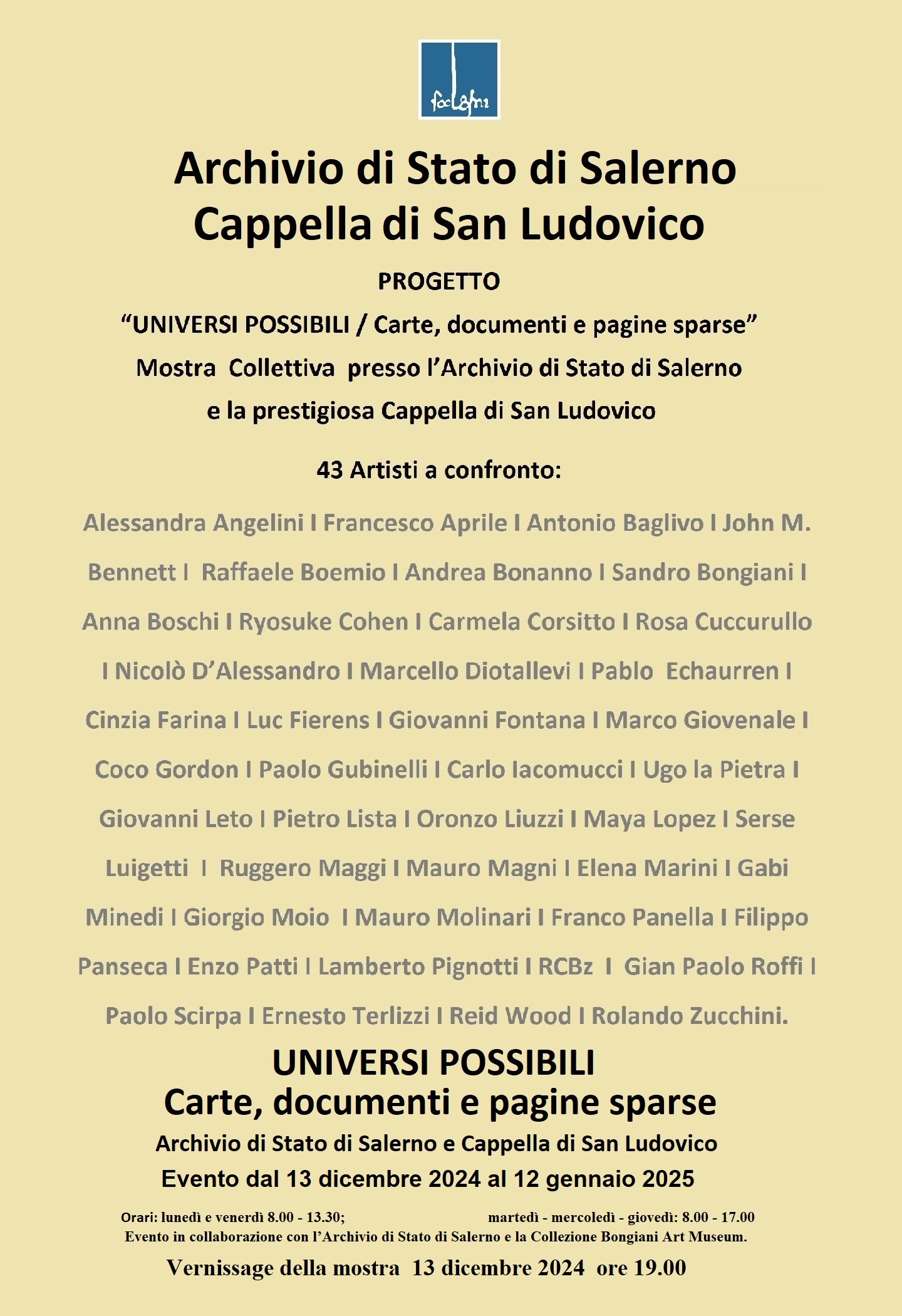 L’Archivio di Stato di Salerno ha il piacere di presentare, venerdì 13 dicembre 2024 alle ore 19.00, la mostra collettiva dal titolo “Universi Possibili, carte, documenti e pagine sparse”, a cura di Sandro Bongiani. La mostra è organizzata dalla Collezione Bongiani Art Museum di Salerno è costituita dalle opere di 43 artisti italiani e stranieri appositamente invitati a questo importante evento collettivo.