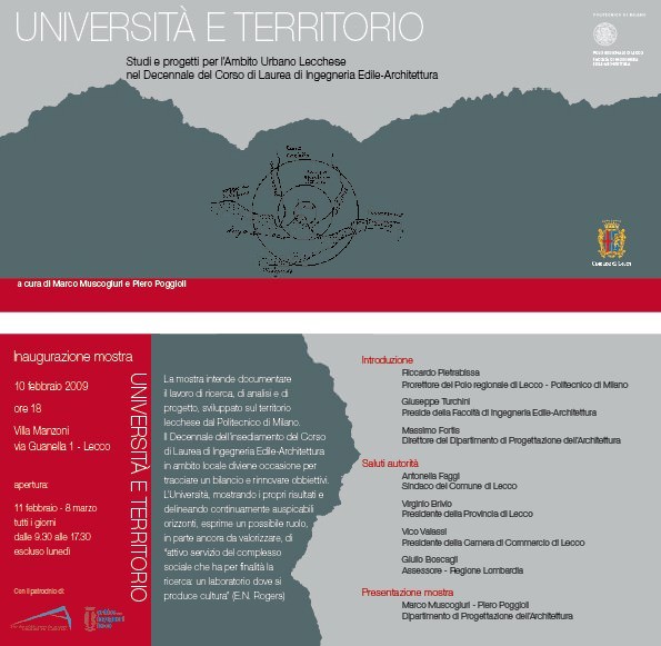 La mostra, allestita presso le Scuderie di Villa Manzoni a Lecco, intende documentare il lavoro di ricerca, di analisi e di progetto svolto all’interno dei Dipartimenti del Politecnico di Milano e i risultati dell’attività didattica della Facoltà di Ingegneria Edile-Architettura presso il Polo regionale di Lecco, a dieci anni dal suo insediamento. La mostra intende essere l’occasione per raccontare al territorio - dal semplice cittadino agli amministratori e agli operatori locali - metodi, contenuti, programmi, progetti e proposte, elaborati all’interno dell’università nell’applicazione al contesto lecchese, nell’intento di promuovere l’Istituzione affinché possa al meglio esercitare il ruolo di incubatore di idee.