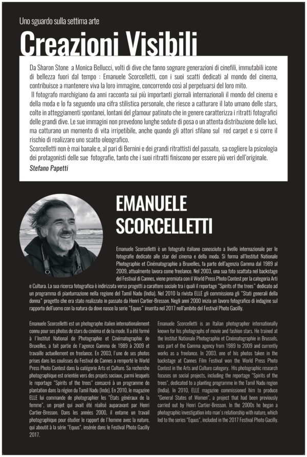 Da Sharon Stone a Monica Bellucci, volti di dive che fanno sognare generazioni di cinefili, immutabili icone di bellezza fuori dal tempo: Emanuele Scorcelletti con i suoi scatti dedicati al mondo del cinema,contribuisce a mantenere viva la loro immagine,concorrendo così al perpetuarsi del loro mito.