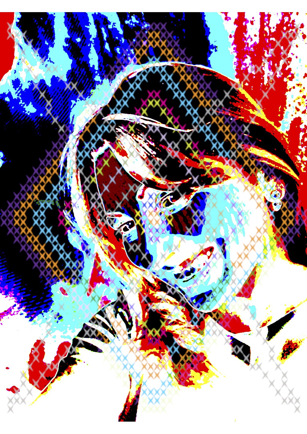 E allora un ritratto-digitale ma che parte dalla selezione di UNA persona e di UNA personalità specifica, dalla elaborazione del SUO volto, ritrova e ricollega le due dimensioni, creando una sorta di meta-linguaggio per immagini; non a caso, a colori, ed in un preciso rapporto di segni e di forme.
