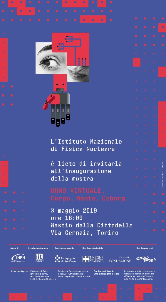 Uomo Virtuale. Corpo, mente, cyborg è una mostra a cura dell’Istituto Nazionale di Fisica Nucleare (INFN) realizzata in collaborazione con IIT- Istituto Italiano di Tecnologia e con il sostegno della Compagnia di San Paolo, il contributo della Regione Piemonte e della Fondazione Palazzo Blu e con il supporto dell’Associazione CentroScienza Onlus. Sono partner scientifici: il Politecnico di Torino, NICO Neuroscience Institute Cavalieri Ottolenghi, NIT Neuroscience Institute Torino dell’Università di Torino, INN-Istituto Nazionale di Neuroscienze, la Fondazione Centro Conservazione e Restauro “La Venaria Reale”e il Museo Regionale Scienze Naturali. La mostra, inoltre, ha il patrocinio del Comune di Torino, della Città metropolitana di Torino e dell’Associazione Italiana di Fisica Medica ed è realizzata in collaborazione con Stella Maris, Università di Pisa, Xché il laboratorio della curiosità, Ce.Se.Di. e Reale Mutua e Turismo Torino. Media partner: RAI Ragazzi, RAI TGR, TuttoScienze. La mostra è inserita nel calendario delle Celebrazioni dei 500 anni dalla morte di Leonardo coordinato dalla Città di Torino.