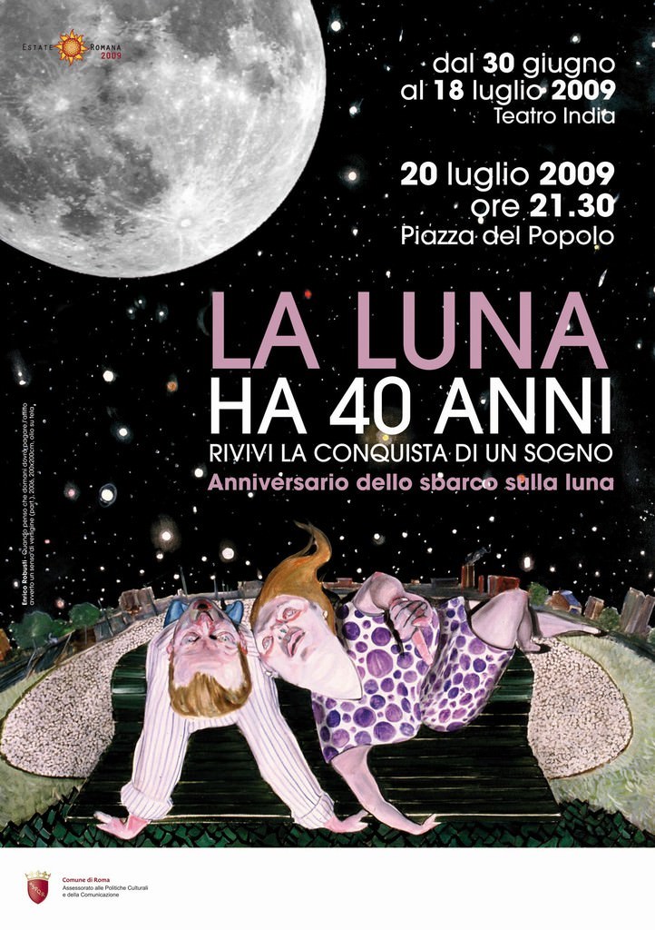In occasione del quarantesimo anniversario dello sbarco dell’uomo sulla Luna (20 luglio del 1969), l’Assessorato alle Politiche Culturali e della Comunicazione del Comune di Roma intende celebrare la ricorrenza con una serie di eventi di grande impatto emotivo, culturale, artistico e scientifico per sottolineare la portata epocale di quel fatto storico, il primo avvenimento globale – si può dire – della storia dell’Umanità. Le cinque iniziative, che si svolgeranno tra il 30 giugno e il 29 luglio 2009, sono state riunite sotto il titolo “LA LUNA HA 40 ANNI. Rivivi la conquista di un sogno. Anniversario dello sbarco sulla luna”.