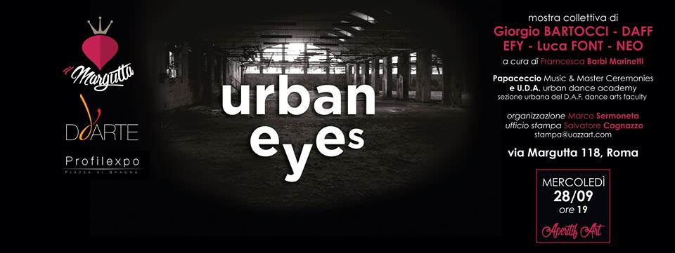 "Urban Eyes", ossia occhi urbani, che suona come “urbanize”, ossia urbanizzare. Un doppio significato per una doppia chiave di lettura. L'Urban, infatti, diventa l'obiettivo e lo strumento di una mostra che raccoglie le opere di Giorgio Bartocci, DAFF, EFY, Luca Font e NEO: cinque nomi noti nell’urban art con in comune l'uso dello spray e la forte identità di un percorso condiviso ma allo stesso tempo individuale.