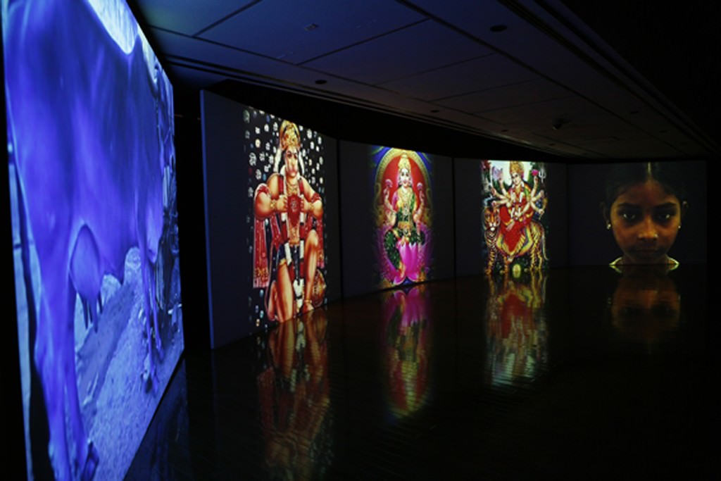 In mostra una serie di opere molto diverse tra loro ma accomunate da un’aura di grande intensità: alcune sono poetiche come i bellissimi light box con paesaggi immaginari in movimento di Sheba Chhachhi o le straordinarie installazioni di Subodh Gupta con semplici oggetti di uso quotidiano come secchi del latte, valigie, utensili da cucina, che si riferiscono allo stato attuale di trasformazione della società indiana o i personaggi in sincrono col proprio riflesso nelle doppie proiezioni di Ranbir Kaleka o ancora il lavoro sulla fragilità della condizione umana di Reena Kallat con dodici sari su cui è riportato un testo in alfabeto Braille, accompagnati da libri di ricette, suoni e profumi.