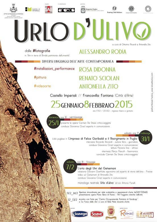 La mostra, con filo conduttore l’albero d’ulivo, è nata intorno alle immagini fotografiche inserite nella pubblicazione “Ulivi in terra di Brindisi –patrimonio dell’umanità” dello scrittore e studioso Alessandro Rodia, e prosegue in un’esposizione che vede coinvolti tre artisti di rilievo internazionale, in un percorso che comincia con la video-arte di Antonella Zito che irrompe squarciando il buio con toni toccanti e drammatici, passando alla sala in cui saranno esposte le foto di Rodia, con l’obiettivo di illustrare e far conoscere l’impegno e l’amore che i popoli hanno profuso per conservare la pianta dell’olivo, proseguendo con una rilettura classica, attraverso la magnifica e romantica pittura del Maestro Renato Sciolan, che riflette sulla durezza del lavoro e alle gite in campagna, per giungere infine alle installazioni e alla performance di Rosa Didonna, che fissa la propria attenzione alla sacralità dell’ulivo, in modo però particolare e davvero curioso e inconsueto