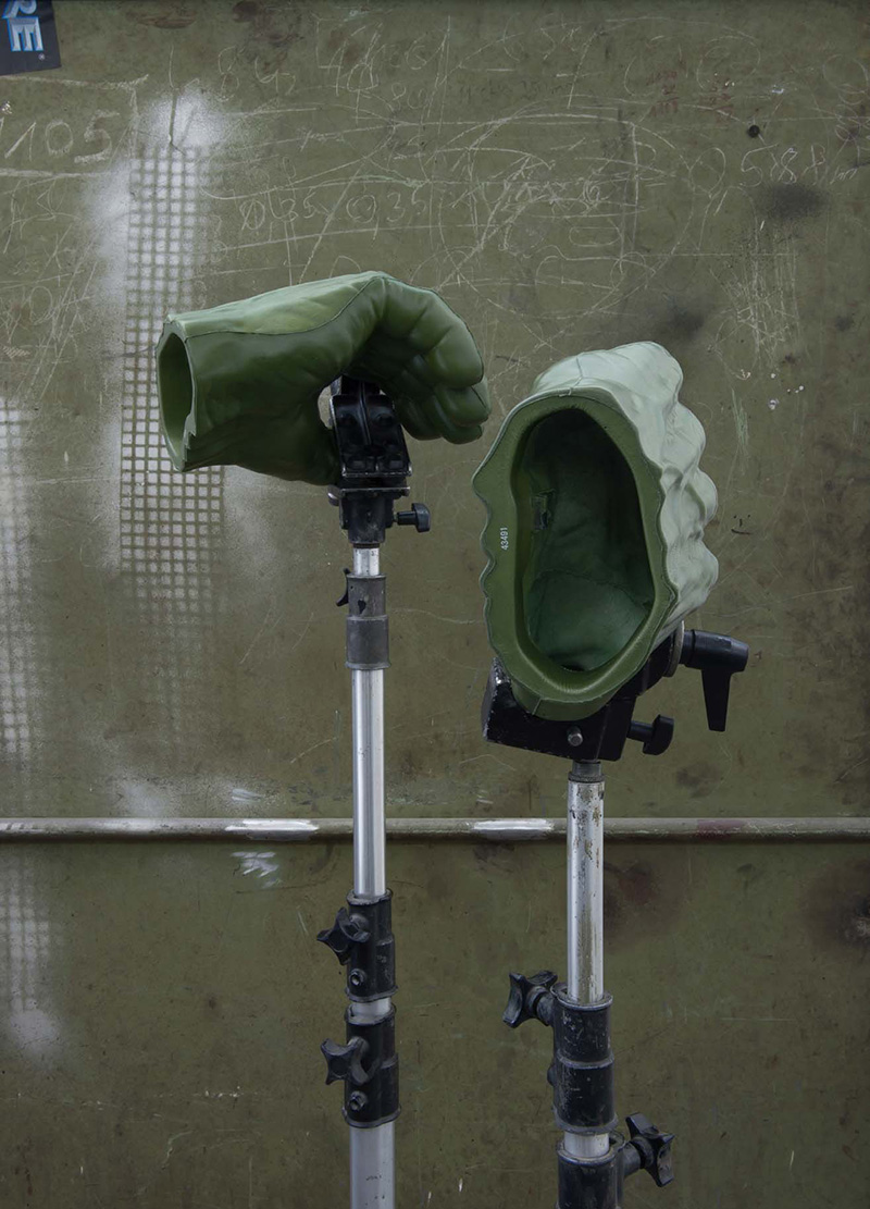 Una scena all’interno della quale si collocano, come presenza materica e randomizzante, le sculture (“Untitled”) dell’artista austriaca Ute Müller. Oggetti prodotti, elementi di scena per diversi scenari. Suggeriti da un contesto familiare o semplicemente trovati, essi vengono spogliati dei nomi che diamo loro, al fine di scrutare e definire un possibile nuovo linguaggio. Spesso rappresentano il vuoto, la matrice di una memoria recente in essi contenuta. Sono disposti a differenti altezze ad indicare un’espansione, una crescita. Accostati, sovrapposti, appesi gli uni agli altri, suggeriscono un’azione performativa e una vita temporanea ribadita dalla presenza di scarabocchi che accentuano l’idea di un provvisorio in continua evoluzione e in contrapposizione a un sistema di coordinate fisse.