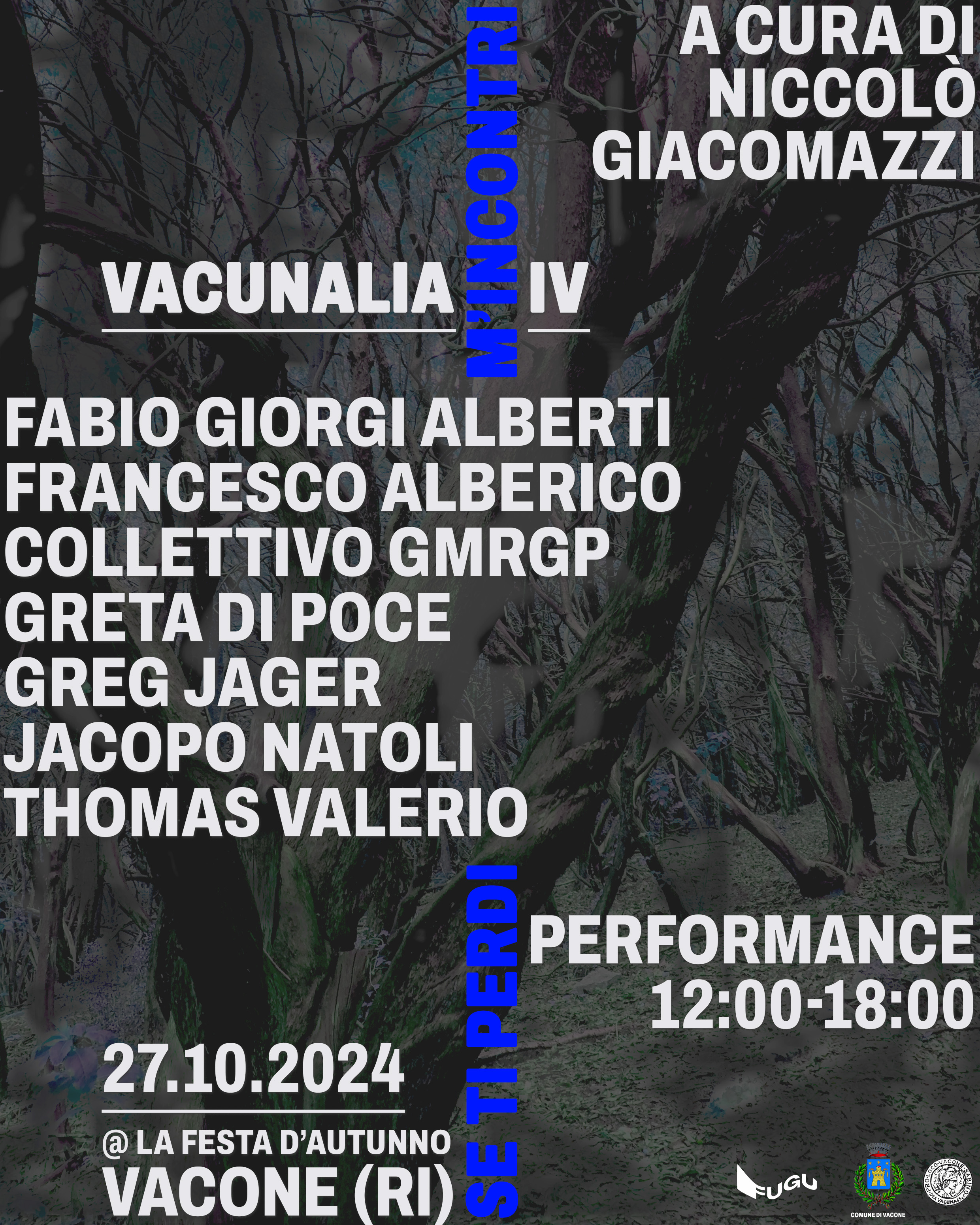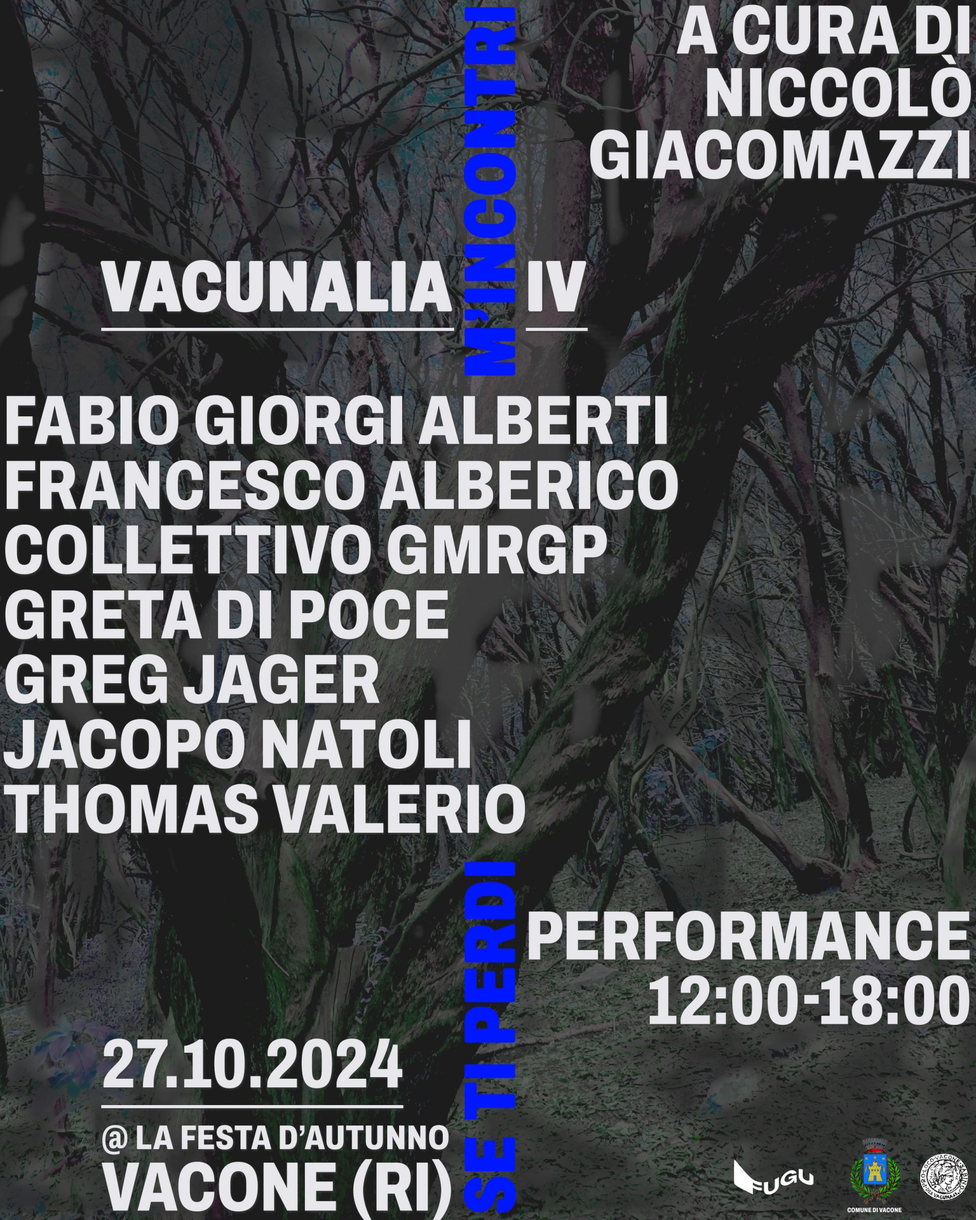 Vacunalia “Se ti perdi m’incontri” è incentrata interamente sulla performance. La quarta edizione prevede una giornata di performance con la partecipazione di sette artisti - Fabio Giorgi Alberti, Francesco Alberico, Collettivo GMRGP, Greta Di Poce, Greg Jager, Jacopo Natoli, Thomas Valerio - dislocate tra il borgo di Vacone (RI) e il bosco sacro del Pago.