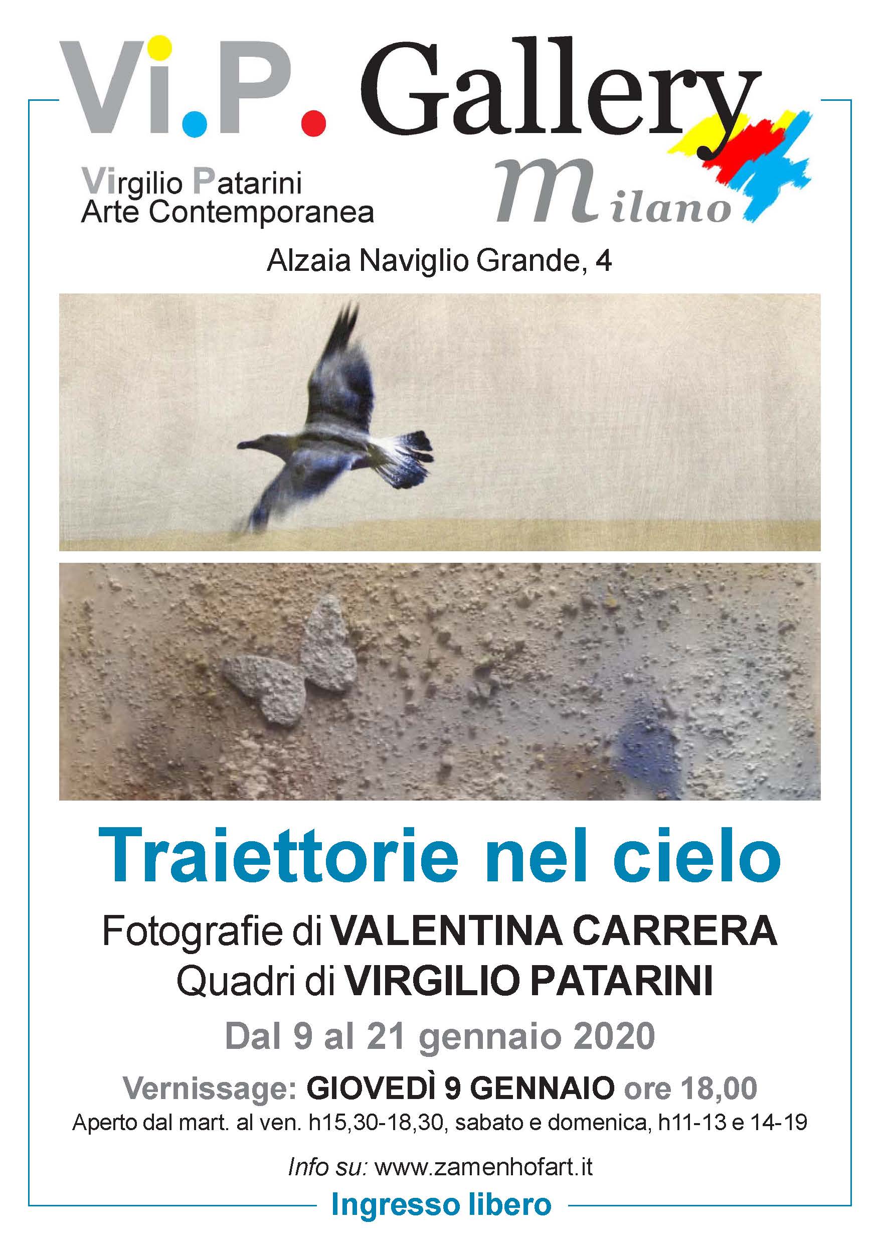 Si inaugura giovedì 9 gennaio 2020, dalle ore 18,00 alla Vi.P. Gallery di Milano, Alzaia Naviglio Grande, 4, la doppia mostra personale di fotografia e pittura intitolata “Traiettorie nel cielo”, che vede a confronto l’opera dell’artista e fotografa Valentina Carrera con quella dell’artista (e critico) Virgilio Patarini, con due personali parallele e incrociate di una ventina di opere ciascuna, quasi tutte di medio/piccolo formato, all’insegna di un’arte contemporanea che indaga i molti spunti metaforici e suggestivi che il tema del volo e delle visioni del cielo offrono, oscillando dall’astrazione lirica ed evanescente delle foto sfocate e mosse della Carrera fino all’informale materico che soggiace alle “epifanie” patariniane, in una accostamento di stili e atmosfere che si rivelano straordinariamente affini, pur nei mezzi differenti utilizzati, in una costante ricerca di un afflato poetico, un battito d’ala capace di trascendere il transeunte del quotidiano, tra una narrazione a tratti fiabesca come la pittura di questa serie di quadri di Patarini e la struggente nostalgia degli scatti della Carrera.
