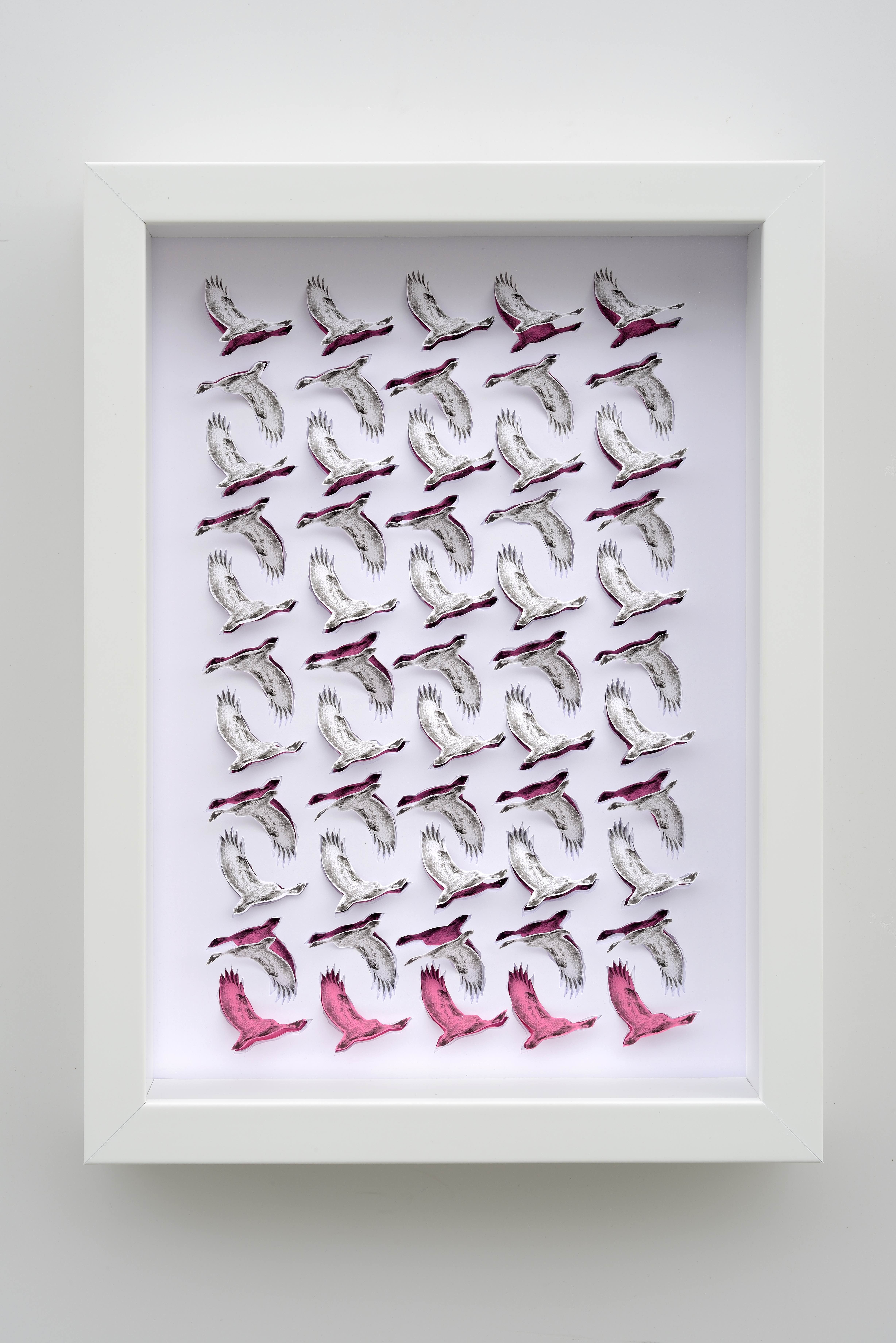 Insieme all’opera del Premio Cairo l’artista presenta i primi voli rosa su tela Le possibilità di un volo (2016), la serie pittorica Filling the sky (2017-2019) e gli intagli su carta La pace che mi hai dato. La pace che mi hai tolto, preludio di Quello che resta. Progressivamente e per progressiva decantazione, l’icona del volo ha lasciato spazio ai fiori, altro simbolo classico, che in questo caso assumono un valore legato al negativo che non diventa mai consolatorio. Dei fiori maledetti, dei “fiori del Male”. Il lavoro di Valentina Colella si può dire che sia evoluto e cambiato, restando fedele però ad una poetica rigorosa pur cambiando i simboli. In questo nuovo ciclo mutano le narrazioni e i riferimenti personali ed emotivi, ma resta il rigore e l’analiticità del suo modus operandi. Come ha avuto modo di scrivere lei stessa, “la mia ricerca necessita di pazienza”, nonostante le incertezze e le accelerazioni del mondo attuale che pone la velocità e il consumo delle immagini, come parametri di valore e d’importanza.