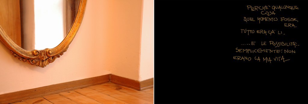"E’ un viaggio a’ rebours, sulle tracce dell’esistenza sottratte all’oblio, quello di Valentina M. Un percorso che ha origine due anni addietro. Un itinerario frammentario tra le pieghe della memoria capace di cogliere sensazioni per consacrarle icone di quell’attimo irripetibile, intenso ed immediato. Immagini di luoghi che sanno di vissuto, flashback del passato che scandiscono lentamente il fluire del tempo. Precise coordinate di un viaggio fisico, che diviene fortemente introspettivo, trovano nel medium fotografico la cifra espressiva di Valentina M. Tagli inconsueti e inquadrature apparentemente casuali congelano usci socchiusi che lasciano penetrare la luce come lama fendente, sedie che attendono presenze che non arriveranno mai, interni in penombra catturati dalle finestre aperte. Con sguardo voyeuristico sul quotidiano domestico, con la sottile ambiguità di chi contempla con il gusto di non sapersi osservato, l’artista attinge dalla poesia visiva e dalla narrative art per dar vita ad un work in progress che guarda al passato per ritrovare ciò che è stato.