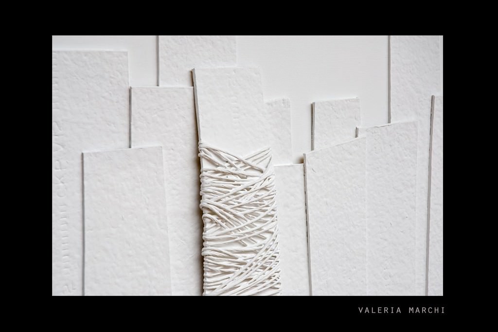 L'artista utilizza un linguaggio astratto e pitto - scultoreo con effetto morbido, quasi atmosferico,meno preoccupato di ragionare sullo spazio e connotato piuttosto da un impatto emozionale.Valeria Marchi infatti compone sulla tela forme di cartoncino all'incirca " rettangolari", improntate ad una geometria "riscaldata" dall'imperfezione, alcune delle quali parzialmente rivestite di spago, e annulla ogni effetto cromatico allagando la tela di bianco, o nero o, al massimo come nei lavori più recenti, del bianco e nero contrapposti.