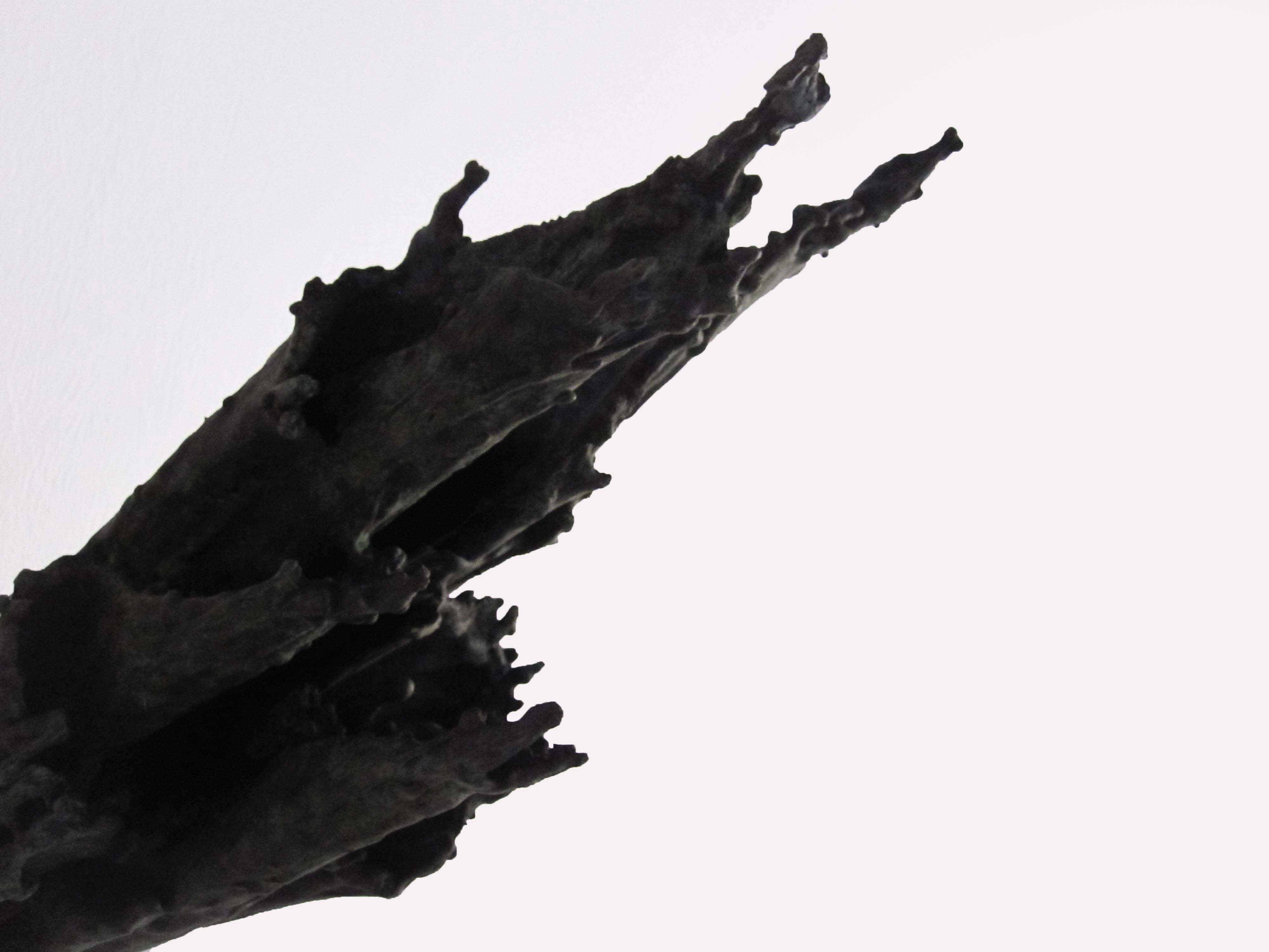 Le masse scultoree modellate e ribollenti, nere, oscure sfidano la gravità (fisica e morale) per aiutarci a percepire la relatività del circostante. La domanda cui dobbiamo rispondere riguarda solo noi stessi ed è un bene perché nell’era della propaganda virtuale, in cui siamo indottrinati a potenziare il nostro ego-involucro ma a sentirci colpevoli di autoreferenzialità e il paradosso ci lacera, è solo con un’attenta analisi, uno stupore, una curiosità costante per ciò che va “oltre” noi stessi e una flessibilità di giudizio aggiornata e sapiente che potremo riconnettere la rete delle relazioni e quindi destinare il nostro messaggio senza ripulsa.