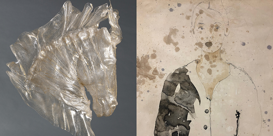 Davide Dall’Osso e Valeria Patrizi unendo le loro opere in questa esposizione, non tracciano nuove rotte o mappe da farci seguire; le loro figure tra presenza e assenza sembrano mostrarci per un istante un cammino possibile tra le nostre emozioni, mostrandoci forse un’alternativa, la prospettiva che esistono infinite possibilità di scelta, di destino, in ogni uno di noi. E così le figure pittoriche femminili evanescenti della Patrizi accompagnate dai loro spiriti guida, che nelle sue grandi tele si rivelano a noi in forme animali, si uniscono alle ‘dissolvenze’ delle sculture umane pervase ‘dall’energia del femminile’ di Dall’osso, come le parti di una strada inconscia. Questo sentiero non si svela attraversando le camere che ospitano la mostra ma viene sussurrato, deve essere intuito. Qui il visitatore-viaggiatore, potrà perdersi per ritrovarsi, ignorare per riconoscere e riconoscersi improvvisamente.