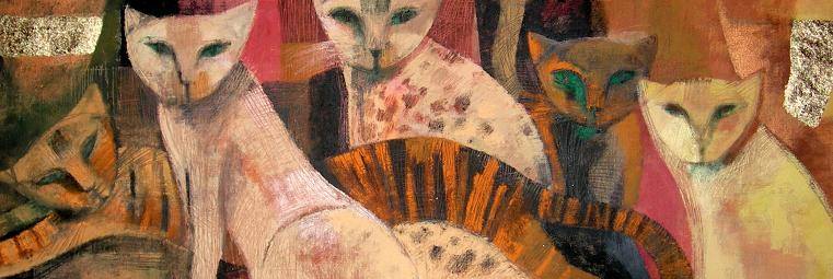 Con Agili sorveglianti la Tomasi spalanca la porta su un mondo che, da sempre, caratterizza la sua ricerca pittorica, e che trova nell’utilizzo della decorazione un aspetto fondante del suo stile. Il divertissement si fonda con lo studio accurato dello spazio e delle forme, dando origine ad immagini di grande lirismo. I felini, che sovente popolano non solo le tele ma l’intero mondo fantasioso e colorato della Tomasi, fatto anche di scultura e di illustrazione, qui hanno una doppia valenza: di compagni inseparabili di Amneris, ma anche di guardiani della tomba che suggellerà l’amore tra Aida e Radamés.