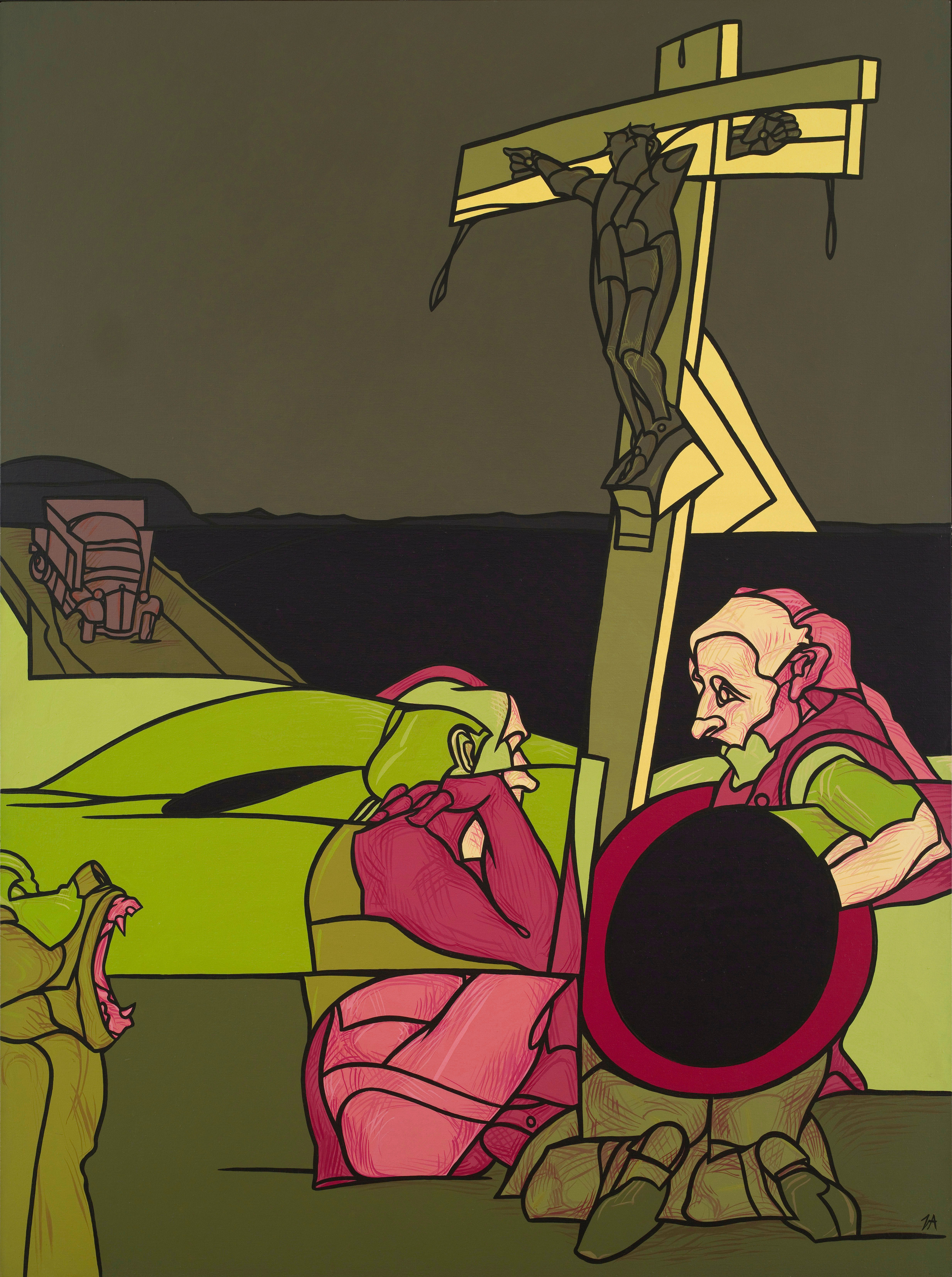 In mostra emergono i rimandi alla storia dell’arte – dalla Trasfigurazione di Raffaello al San Pietro di Crivelli – e le citazioni letterarie e poetiche, lavori emblematici come Calvario ispirato a W.B. Yeats o Figura crocifissa dedicato al pittore Ben Shahn che tanto aveva rappresentato la fine degli anarchici Sacco e Vanzetti. Compaiono angeli – figure nate in occasione della scomparsa del padre e poi sempre più presenti come simboli universali – e sfingi, Caronte e le divinità del mondo classico, ma anche icone dell’ebraismo e dell’Islam come il muro del pianto, le menorah e le moschee.