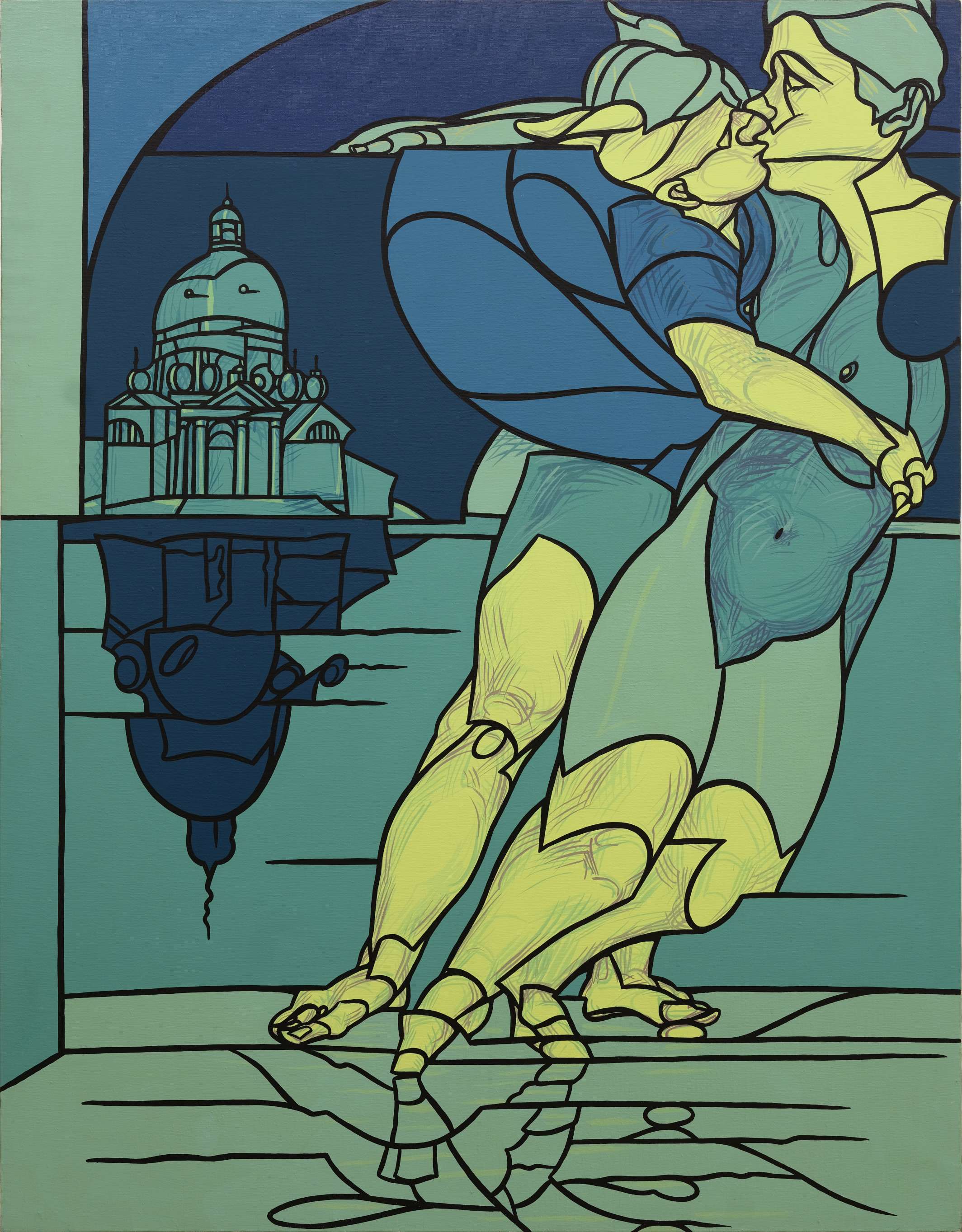 All’assenza di sfumature pittoriche e quindi grazie a una tecnica raffinata che privilegia campiture dense e piatte, e una tavolozza che muta pur rimanendo fedele a sé stessa sin dagli esordi più compiuti, si contrappone un’iconografia nuova che va decifrata di volta in volta, perché frutto di stratificazioni, rimandi e ossessivi ricorsi a determinati luoghi in cui tutto convive, l’alto e il basso, la mitologia e un amplesso, l’architettura e il grande tema del quadro nel quadro, la musica e un radiatore. Perciò questa mostra è un viaggio tra gli infiniti mondi di Adami, ritmati dal suo inconfondibile tratto che è disegno e pensiero insieme.