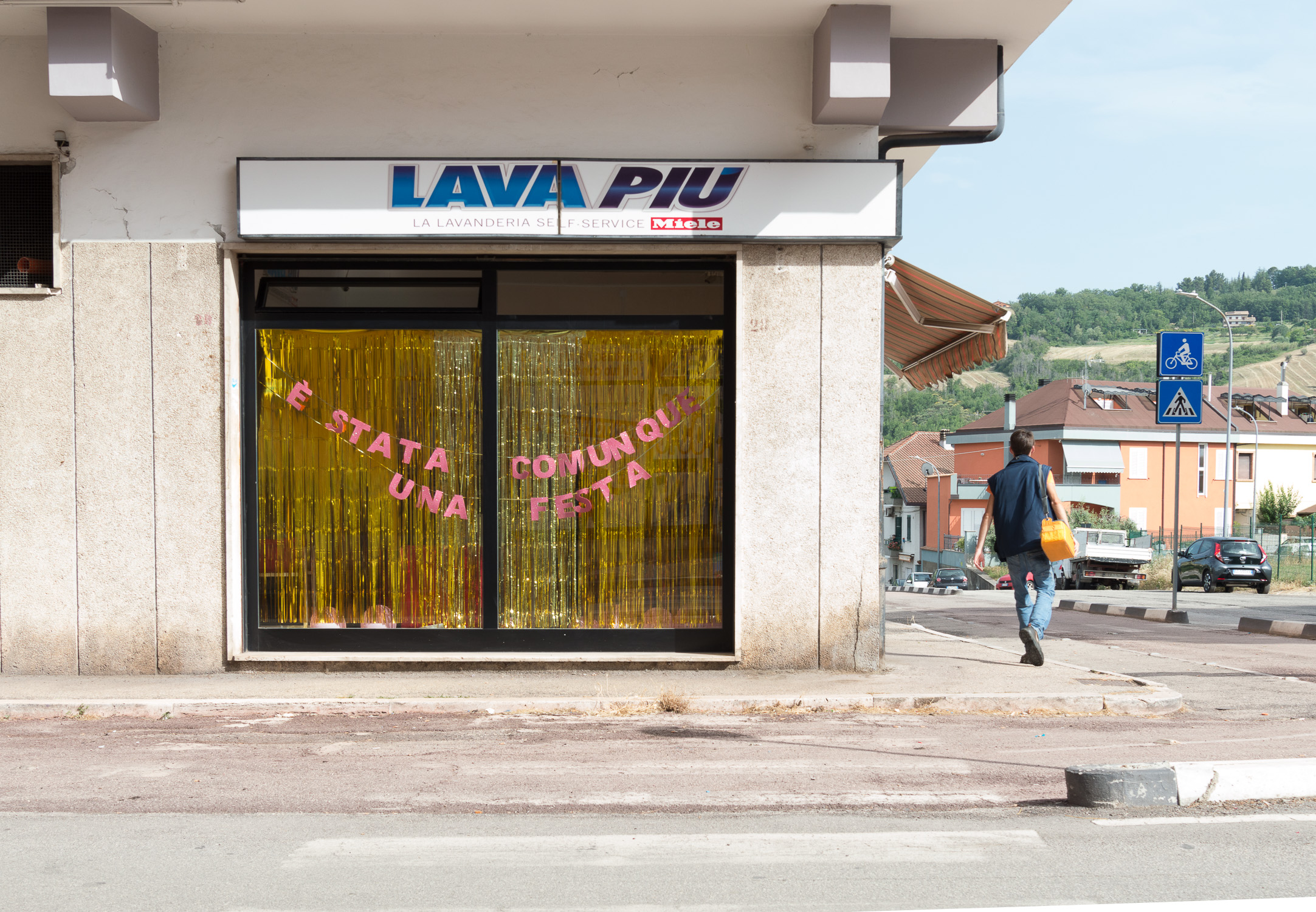 A festoon of pink letters cuts through a gold fringe curtain resembling a smile. Pink balloons and used tissues rest on the floor as if they were the ashes of last night's party. “ È stata comunque una festa” [It has been a party anyway] recites the festoon. This artwork results from a fictional dialog between the artist and the gigolo pictured on the song “Tremilalire”, written in 1977 by homosexual artist and songwriter Alfredo Cohen. His life has been a party, tells Cohen-gigolo, while sitting on a outskirts' movie theatre. It has been a party anyway, in spite of the marginalisation, the stigmatisation, the aggressions and the violence which have always marked individuals who exist outside the heteronormativity. That is “the other patrimony” the one outside official history, which Valerio Torrisi intends to celebrate with this artwork.