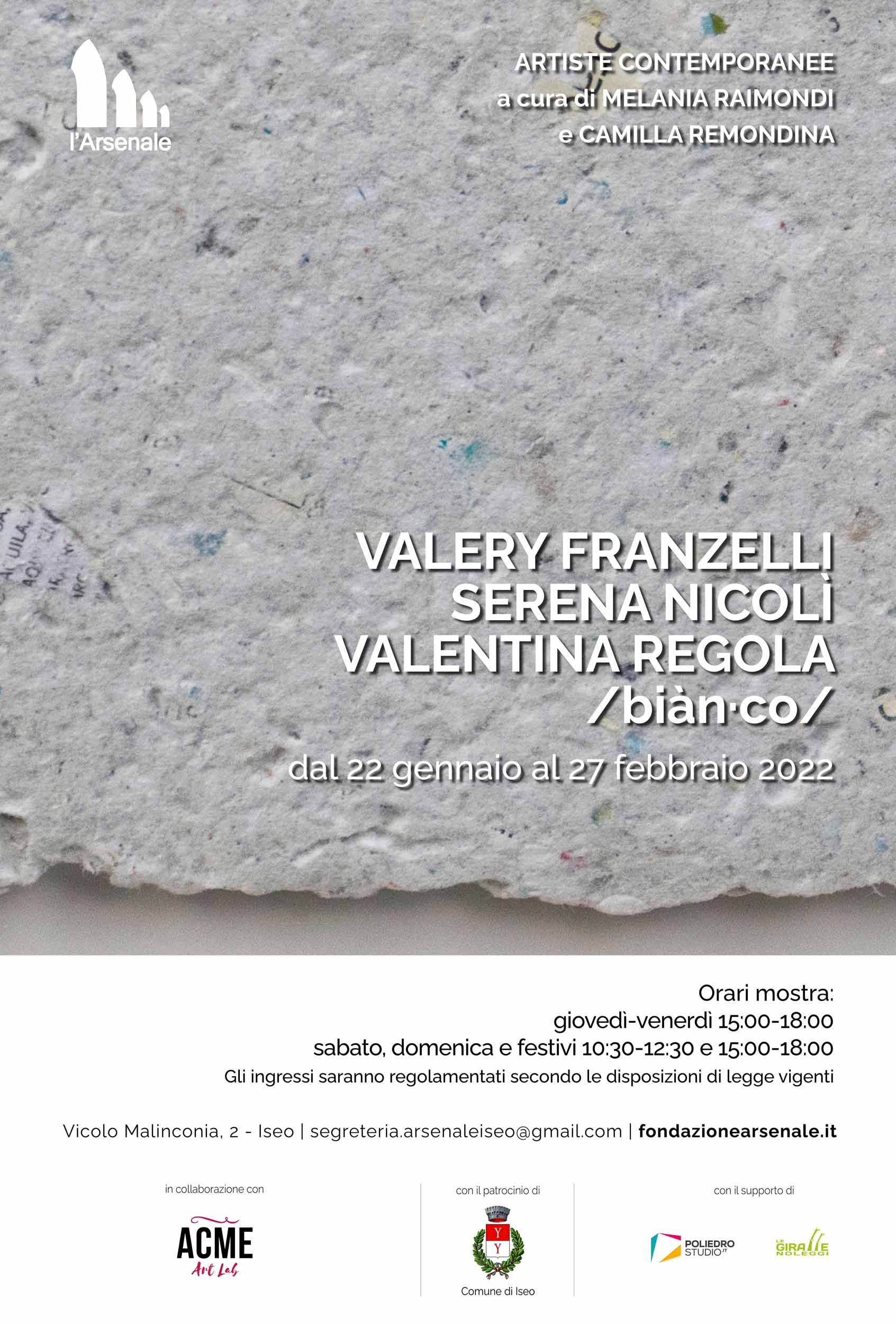 All’Arsenale di Iseo il prossimo 22 gennaio 2022 inaugura la collettiva che riunisce tre artiste contemporanee emergenti che operano prevalentemente sul territorio bresciano, dove si sono formate: Valery Franzelli (Chiari, 1998), Serena Nicolì (Varese, 1985) e Valentina Regola (Brescia, 1995).