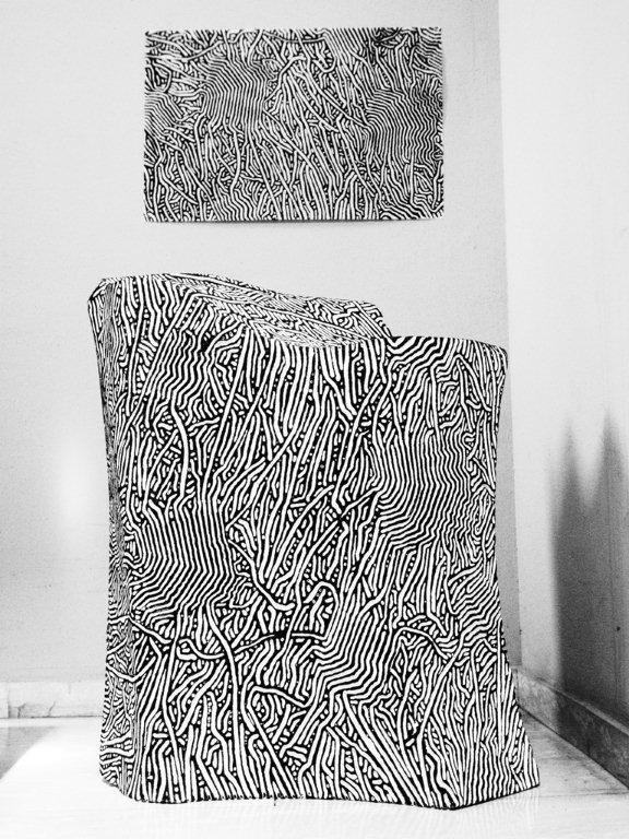 Una serie di sculture realizzate con polistirene ad alta densità inciso a calore segnano l’inquieta occupazione spaziale messa in opera da Murasecchi con un lavoro che reinterpreta lo spazio e la funzione dell’edificio normanno attraverso misteriose opposizioni compositive e segniche.