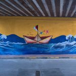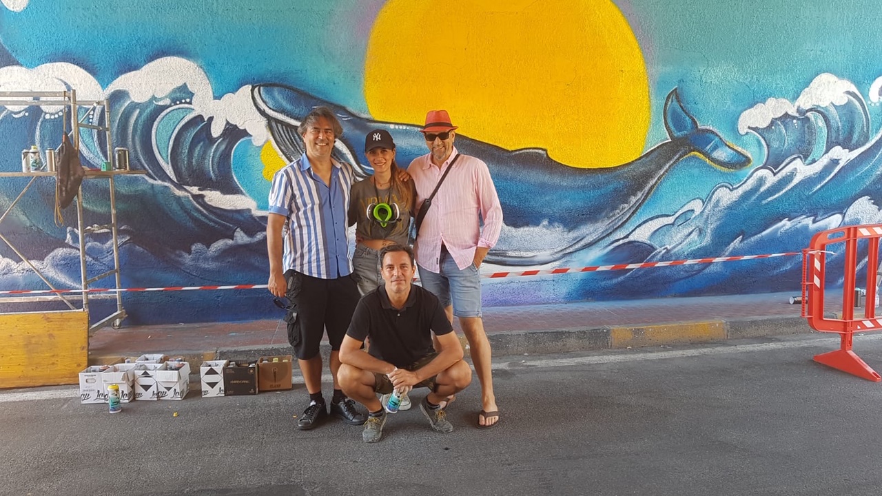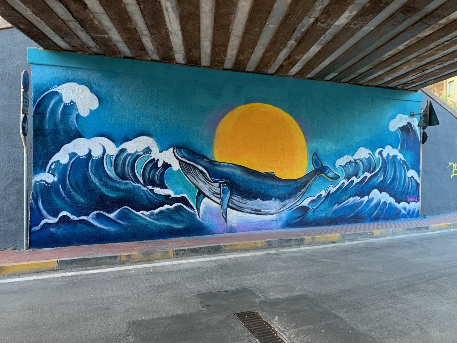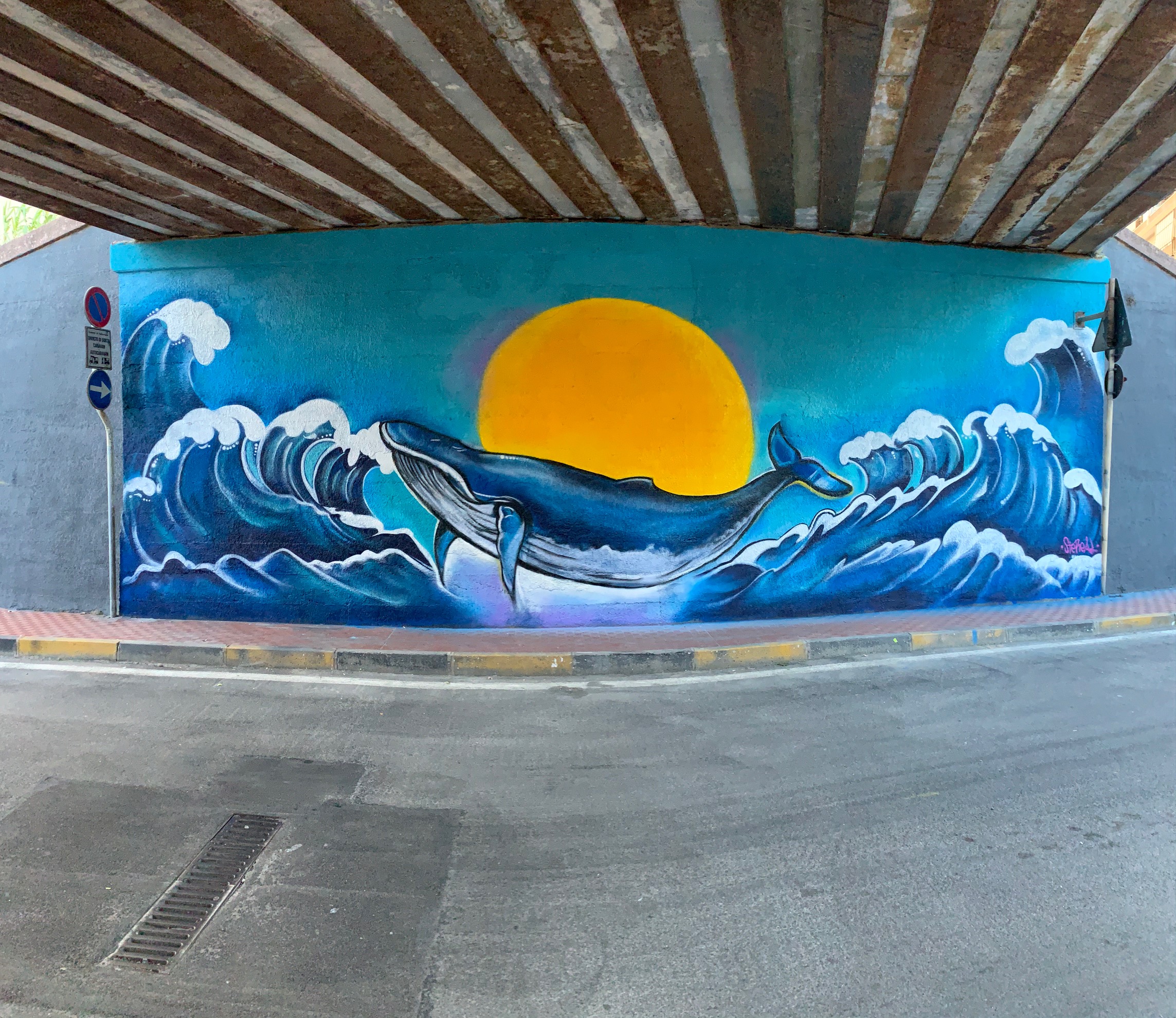L’intervento urbano di lancio di VallecrosiArt è affidato alla mano artistica di Stefania Marchetto in arte SteReal che dal 9 luglio è a Vallecrosia alle prese con la creazione di due grandi murales a tema marino, volti a riempire e decorare entrambi i lati del sottopassaggio di via Cristoforo Colombo. Dipingendo un totale di 24 metri di muro, su di un lato SteReal ha dato vita a un’enorme balena immersa nel blu, tra le onde del mare, mentre sull’altro ha dipinto una nave di carta che lo attraversa.