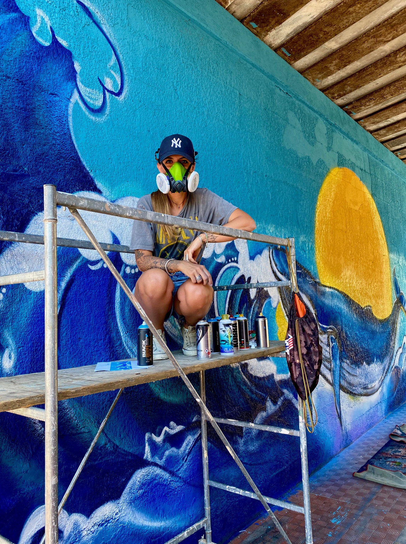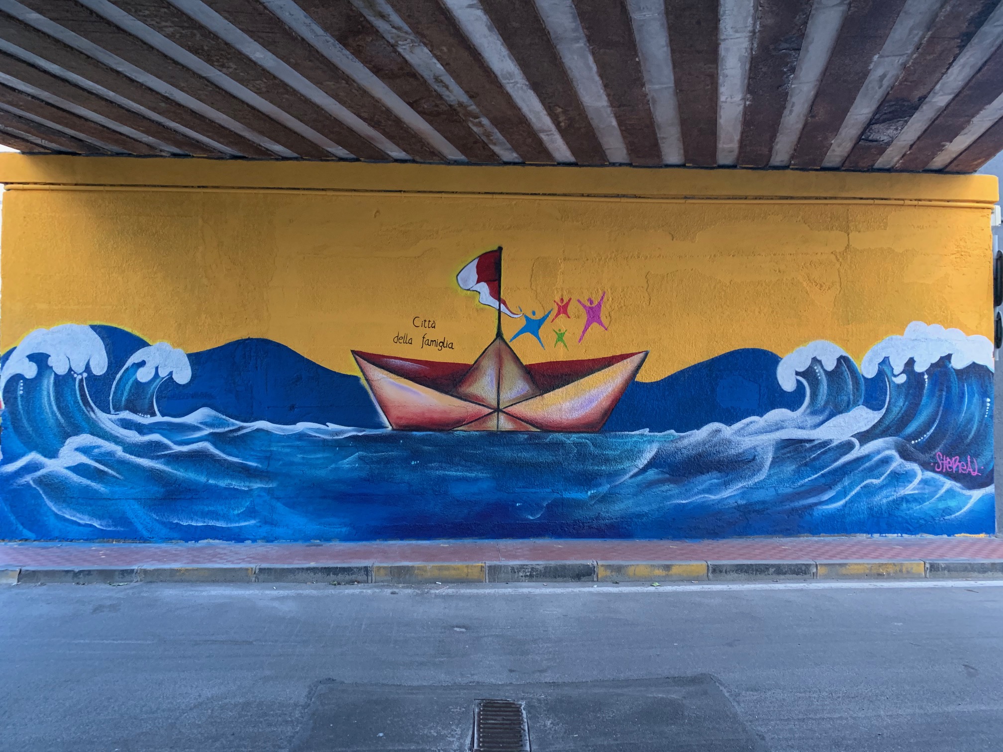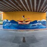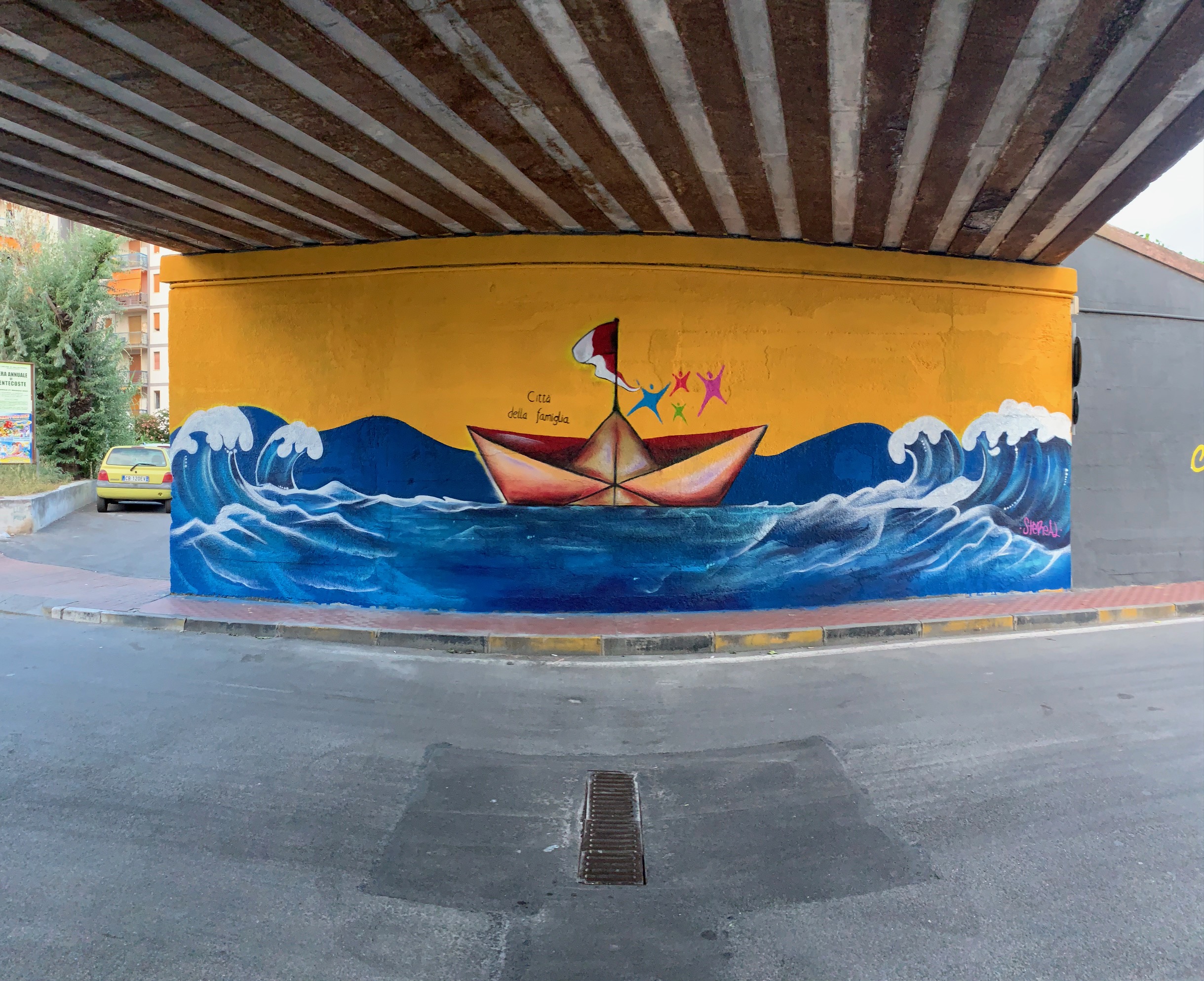 L’intervento urbano di lancio di VallecrosiArt è affidato alla mano artistica di Stefania Marchetto in arte SteReal che dal 9 luglio è a Vallecrosia alle prese con la creazione di due grandi murales a tema marino, volti a riempire e decorare entrambi i lati del sottopassaggio di via Cristoforo Colombo. Dipingendo un totale di 24 metri di muro, su di un lato SteReal ha dato vita a un’enorme balena immersa nel blu, tra le onde del mare, mentre sull’altro ha dipinto una nave di carta che lo attraversa.
