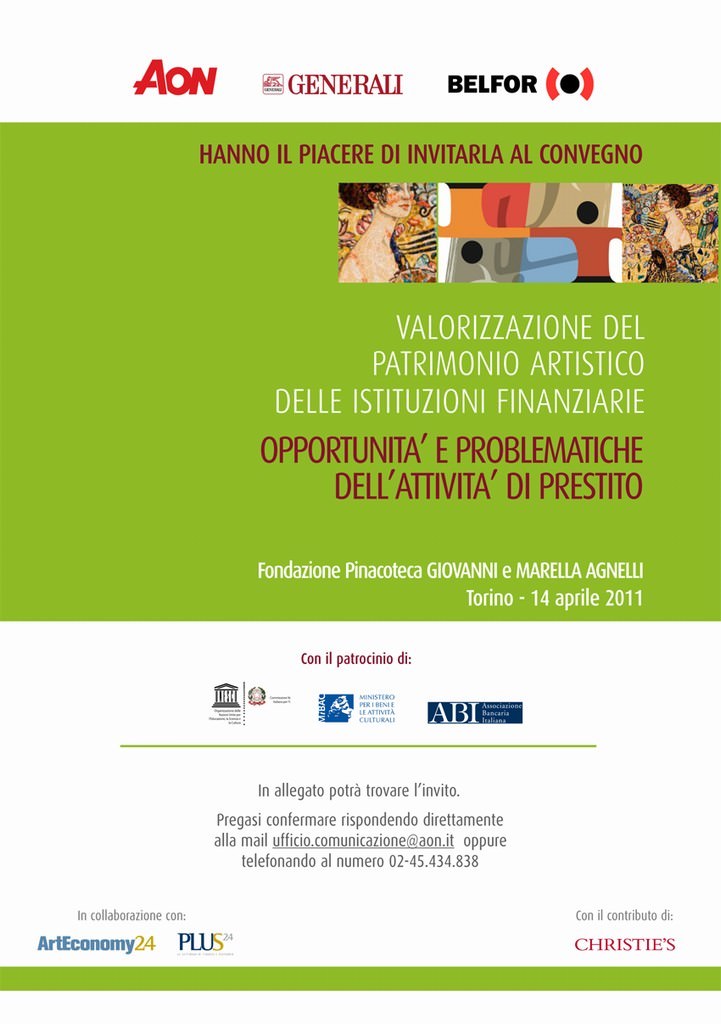 Il convegno che ha ottenuto il patrocinio dell’Unesco, del Ministero dei Beni Culturali e dell’Associazione Bancaria Italiana, è promosso da Aon, società leader nel settore del brokeraggio assicurativo avente una Divisione dedicata al Fine Arts & Jewellery, da Assicurazioni Generali e da Belfor, società internazionale, leader mondiale nel risanamento post-sinistri.