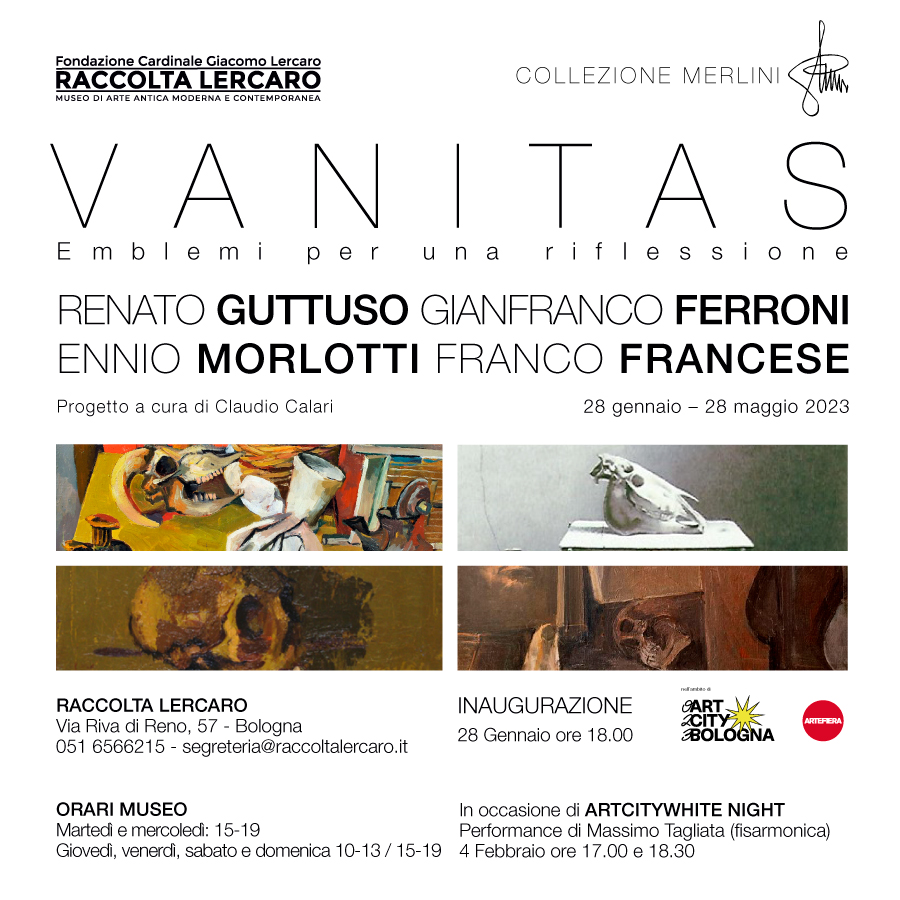 Cinque opere della prestigiosa Collezione Merlini, presentate alla Raccolta Lercao in occasione di Art City 2023, restano emblematiche per la costruzione di una mise en scéne affascinante e dentro alla quale si specchiano tutte le peculiarità della Vanitas.